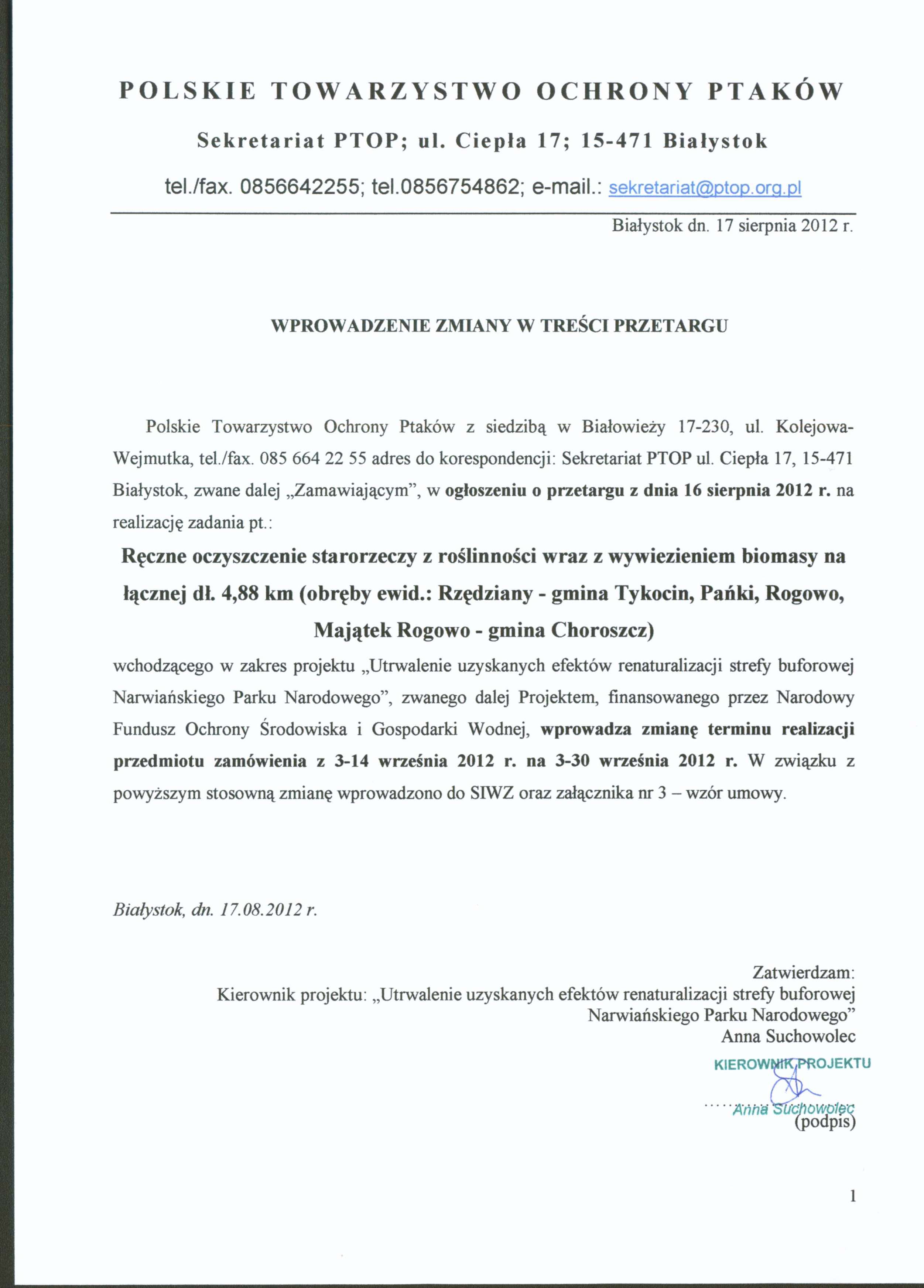 W dniu 16 sierpnia 2012 r. Polskie Towarzystwo Ochrony Ptaków z siedzibą w Białowieży 17-230, ul. Kolejowa-Wejmutka, tel./fax. 085 664 22 55 adres do korespondencji: Sekretariat PTOP ul. Ciepła 17, 15-471 Białystok, w oparciu o przepisy Kodeksu Cywilnego (Dz.U. z 1964r. nr 16, poz. 93 ze zm.) zwanego dalej „k.c.” oraz Regulaminu Zawierania Umów ogłasza: PRZETARG W TRYBIE ART. 70¹ – 705 KODEKSU CYWILNEGO OGŁOSZENIE O PRZETARGU na realizację zadania pt.: Ręczne oczyszczenie starorzeczy z roślinności wraz z wywiezieniem biomasy na łącznej dł. 4,88 km (obręby ewid.: Rzędziany - gmina Tykocin, Pańki, Rogowo, Majątek Rogowo - gmina Choroszcz), wchodzącego w zakres projektu „Utrwalenie uzyskanych efektów renaturalizacji strefy buforowej Narwiańskiego Parku Narodowego”, finansowanego przez Narodowy Fundusz Ochrony Środowiska i Gospodarki Wodnej. Poniżej załączniki do pobrania.