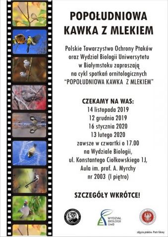 POPOŁUDNIOWA KAWKA Z MLEKIEM wraca! Już po raz trzeci mamy ogromną przyjemność zaprosić Was na spotkania ornitologiczne organizowane wspólnie przez Polskie Towarzystwo Ochrony Ptaków i Wydział Biologii Uniwersytetu w Białymstoku. W tym sezonie zmieniamy nieco formułę i czeka Was jeszcze więcej pięknych fotografii przyrody i porywające opowieści zacnych gości. Pierwsze spotkanie już 14 listopada i nie może Was zabraknąć. Szczegóły wkrótce, śledźcie nasz profil na FB i stronę PTOP. W dzisiejszym zaproszeniu rozganiamy chmury zdjęciami ptaków Piotra Górnego. Do zobaczenia!