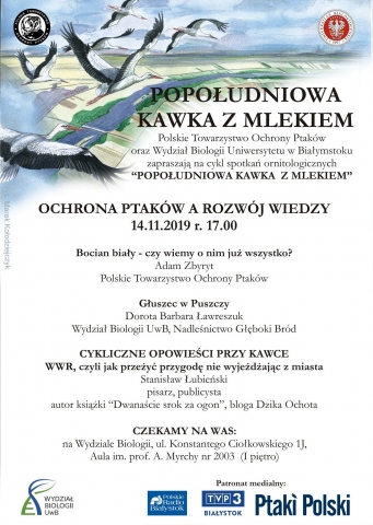Polskie Towarzystwo Ochrony Ptaków oraz Wydział Biologii Uniwersytetu w Białymstoku wspólnie zapraszają na spotkania z cyklu “POPOŁUDNIOWA KAWKA Z MLEKIEM”. Pierwsze spotkanie już 14 listopada 2019 r. o godzinie 17.00.