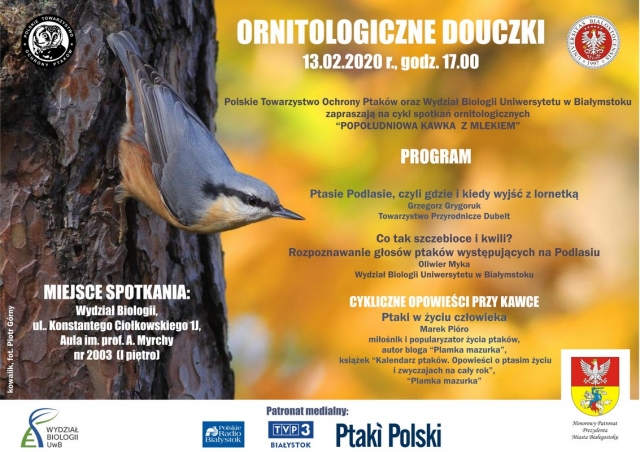Polskie Towarzystwo Ochrony Ptaków oraz Wydział Biologii Uniwersytetu w Białymstoku wspólnie zapraszają na ostatnie już w tym sezonie spotkanie z cyklu “POPOŁUDNIOWA KAWKA Z MLEKIEM”. Wiosna coraz bliżej i warto przygotować się na przyrodnicze odkrywanie świata ptaków. Przed nami ORNITOLOGICZNE DOUCZKI, na których dowiedzą się Państwo gdzie i kiedy wybrać się na ornitologiczne spacery i jak rozpoznawać napotkane ptaki po głosie. W drugiej część spotkania gościmy Marka Pióro, miłośnika i popularyzatora życia ptaków, autora kultowego już bloga „Plamka mazurka” oraz książek „Plamka mazurka” i „Kalendarz ptaków. Opowieści o ptasim życiu i zwyczajach na cały rok". Zdjęcia mazurków - Piotr Górny.