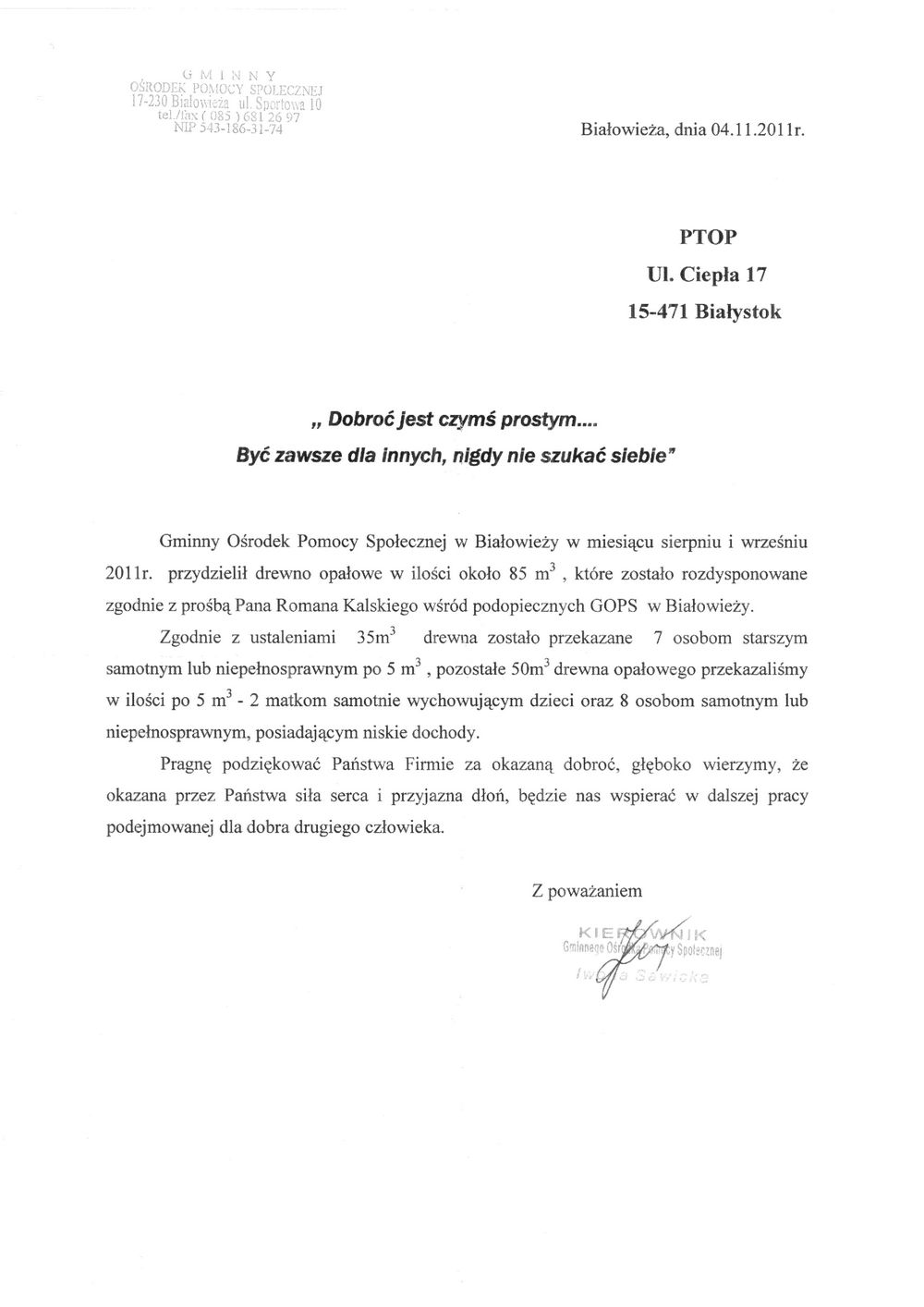 Dzięki współpracy PTOP z Gminnym Ośrodkiem Pomocy Społecznej w Białowieży, drewno trafiło bezpośrednio do osób najbardziej potrzebujących.