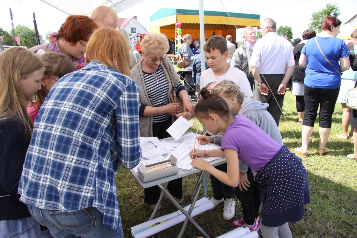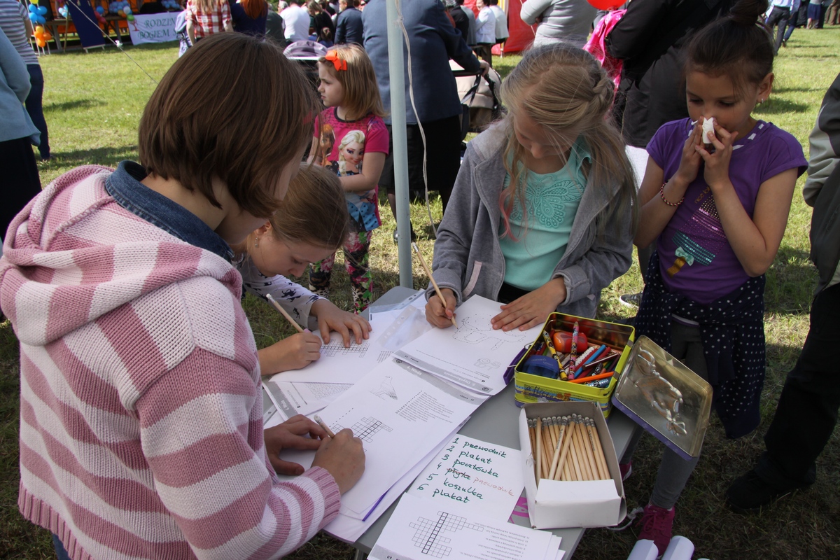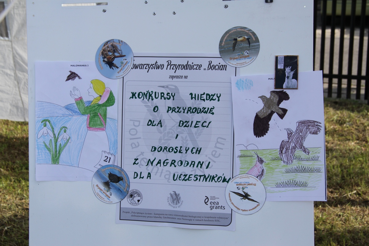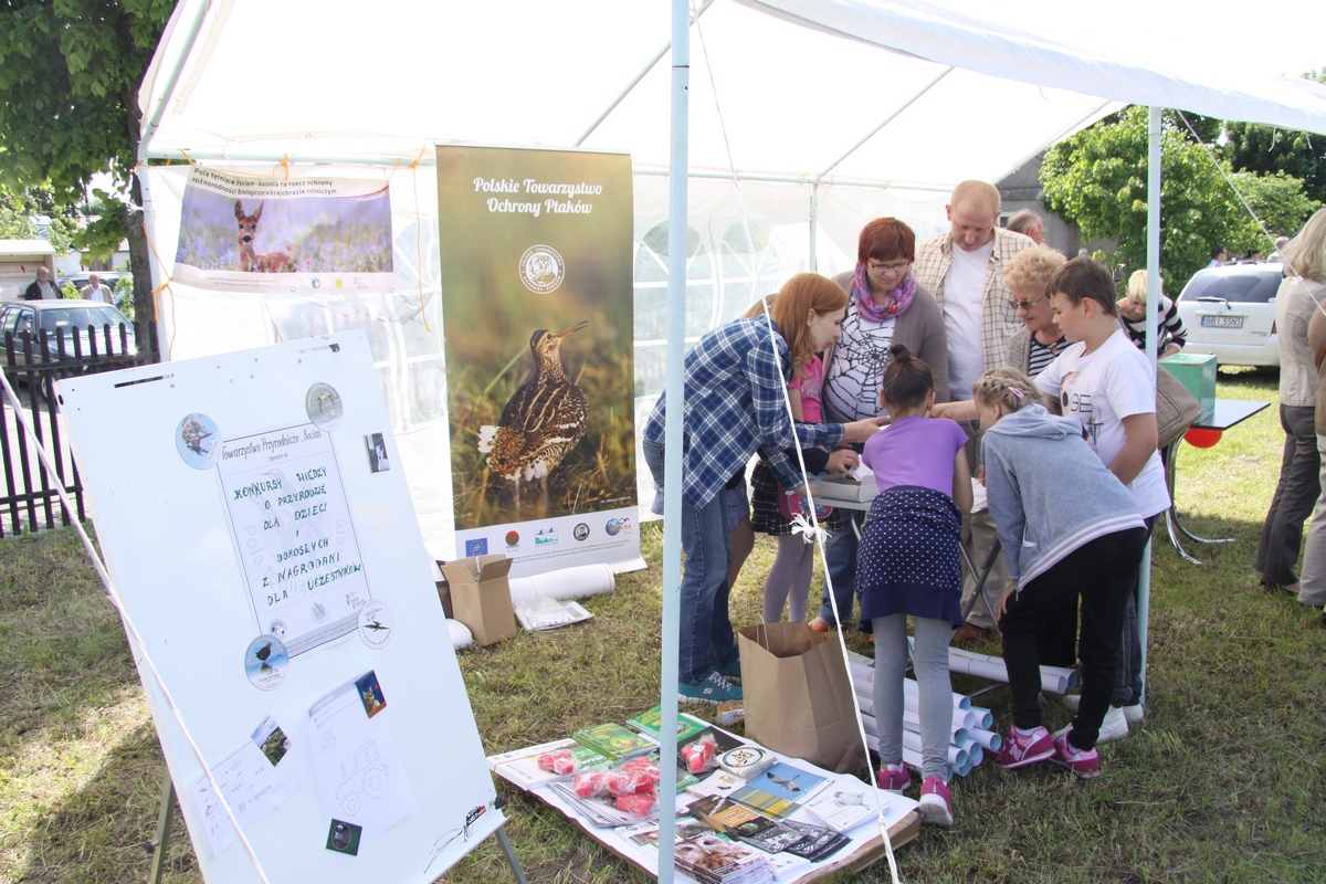 My prezentowałyśmy materiały edukacyjne w ramach projektu „Pola tętniące życiem”. Dzieci i dorośli wykazali się wiedzą przyrodniczą rozwiązując przygotowane przez nas krzyżówki, wykreślanki i rebusy. Dla chętnych miałyśmy kolorowanki, a dla najmłodszych proste zadania rysunkowe. Dzieci chętnie wykonywały wszystkie zadania ponieważ na wszystkich czekały upominki: ołówki, plakaty, pocztówki, naklejki oraz koszulki.