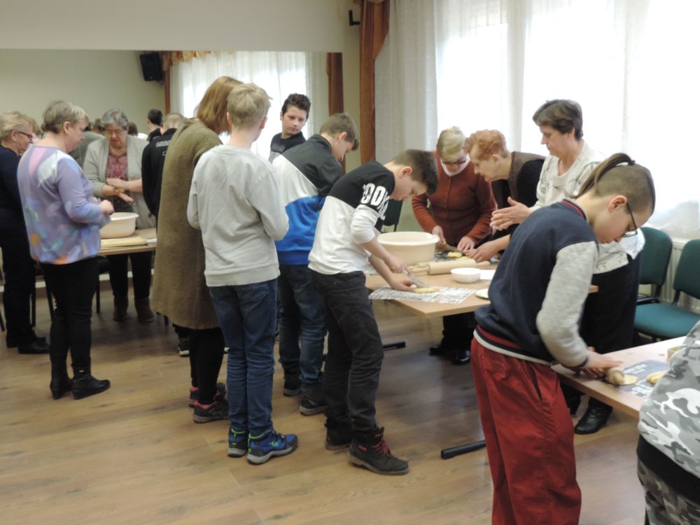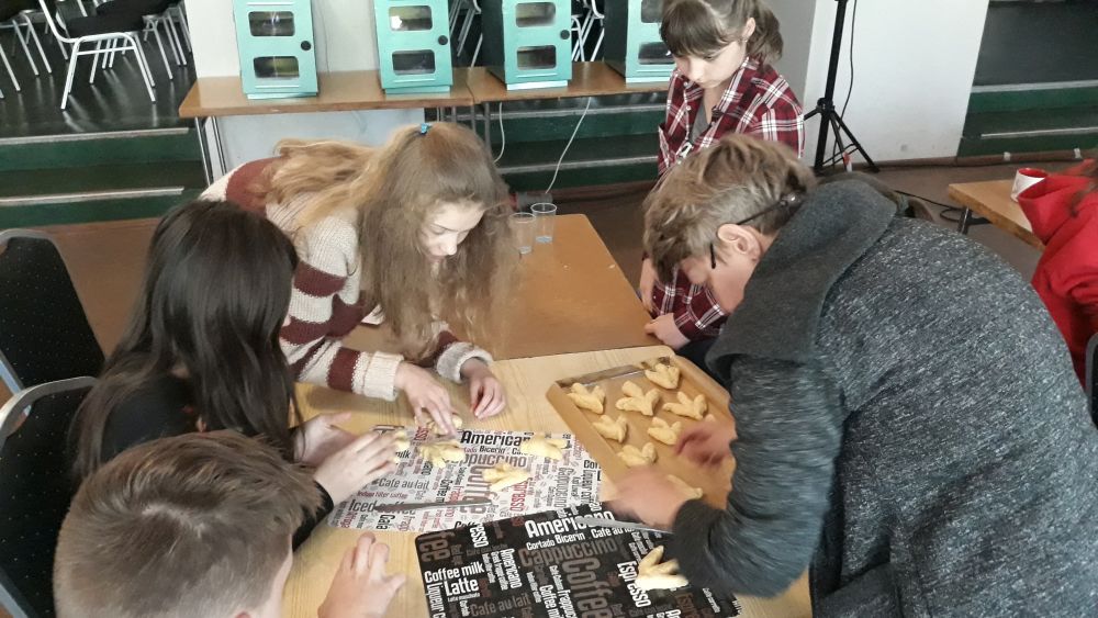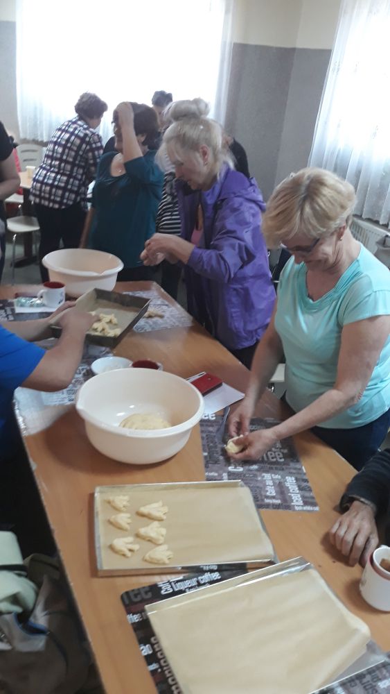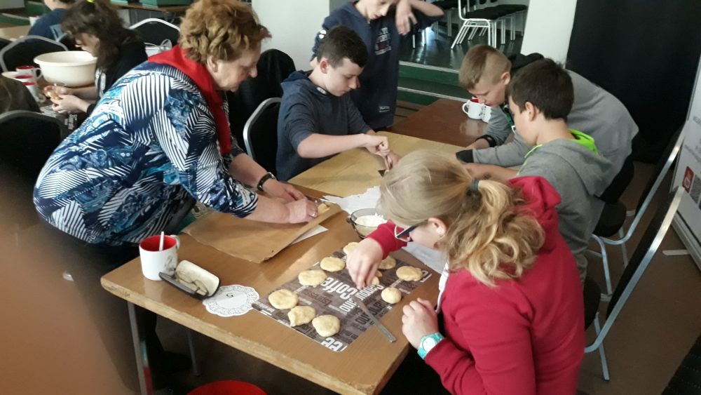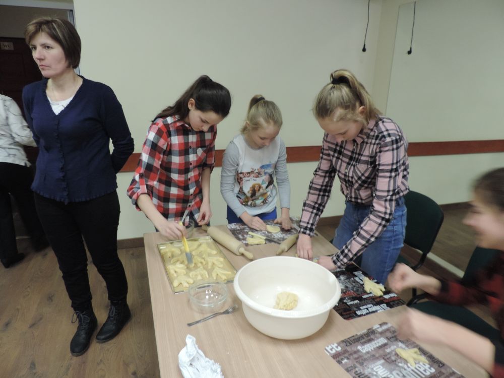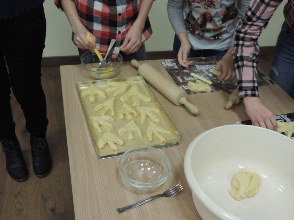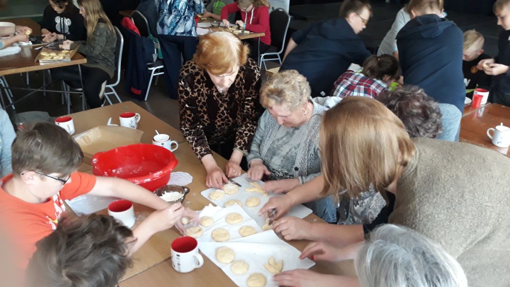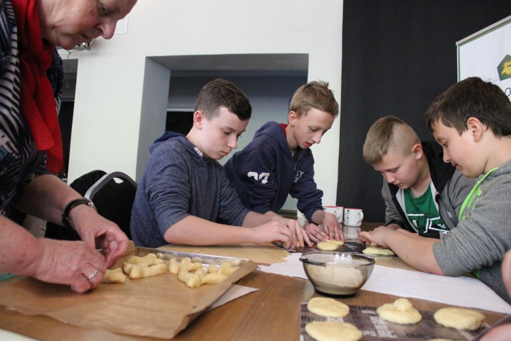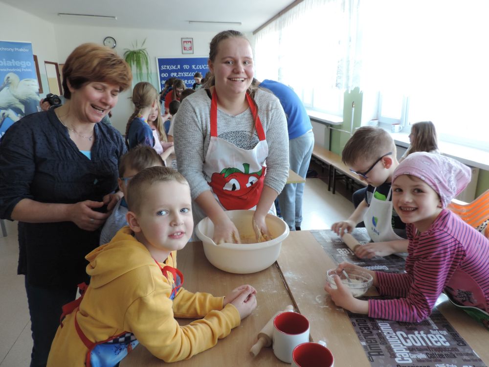 W tym roku, podobnie jak w poprzednim, zorganizowaliśmy 5 spotkań z mieszkańcami gmin objętych projektem w celu wspólnego pieczenia bocianich łap. Wszystkie spotkania bardzo się udały, cieszyły się dużym zainteresowaniem dorosłych i dzieci. Uczestnicy zapoznali się z zapomniana tradycją, którą było pieczenie drożdżowych bułek w kształcie czteropalczastej łapy bociana zwanych „busłowymi łapami”. W gwarze ludowej „busioł” oznaczał bociana. Ludzie wierzyli, że wkładając do gniazda „busłowe łapy”, zwabią ptaka znajdującego się na ich posesji, a dzięki temu szczęście i dostatek nie opuści ich przez cały rok. Gniazdo bocianie miało też chronić dom przed uderzeniem pioruna. Bułki piekło się 25 marca – w Kościele katolickim jest to ważne święto „Zwiastowania Najświętszej Marii Panny”. Dla każdego uczestnika mieliśmy upominek w postaci naszego projektowego kubka.