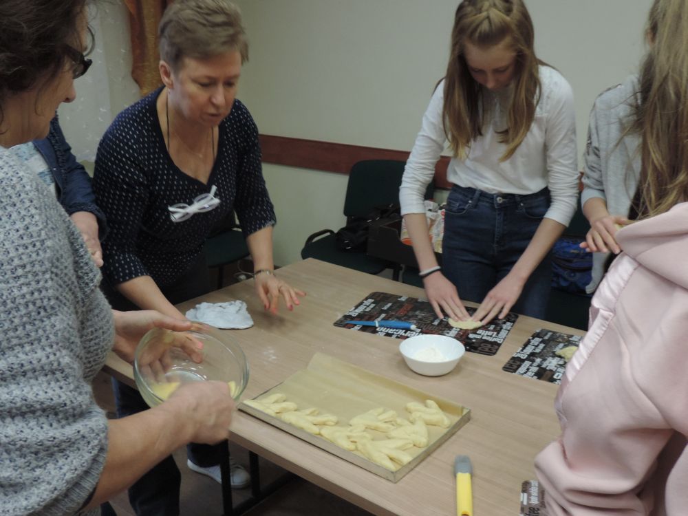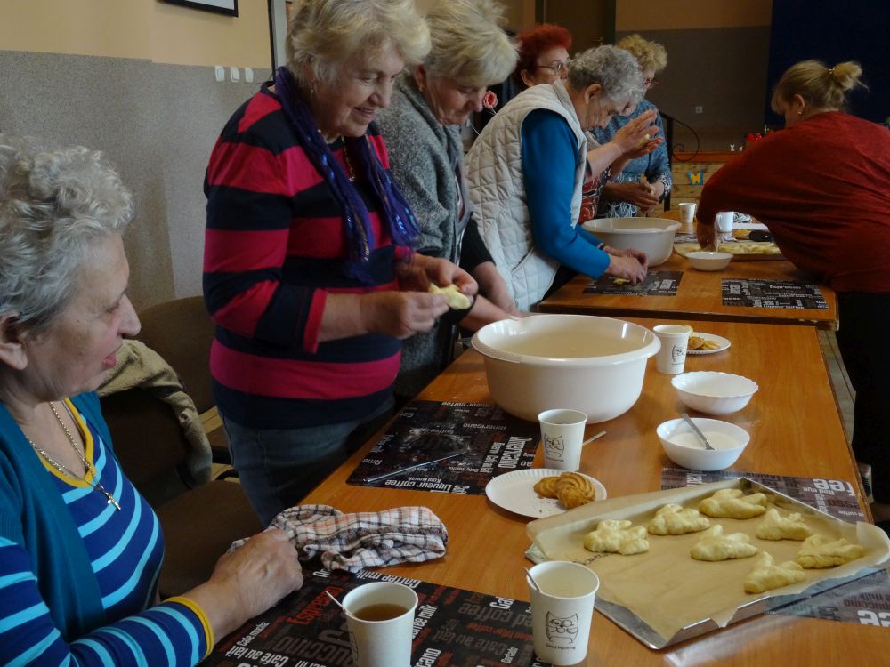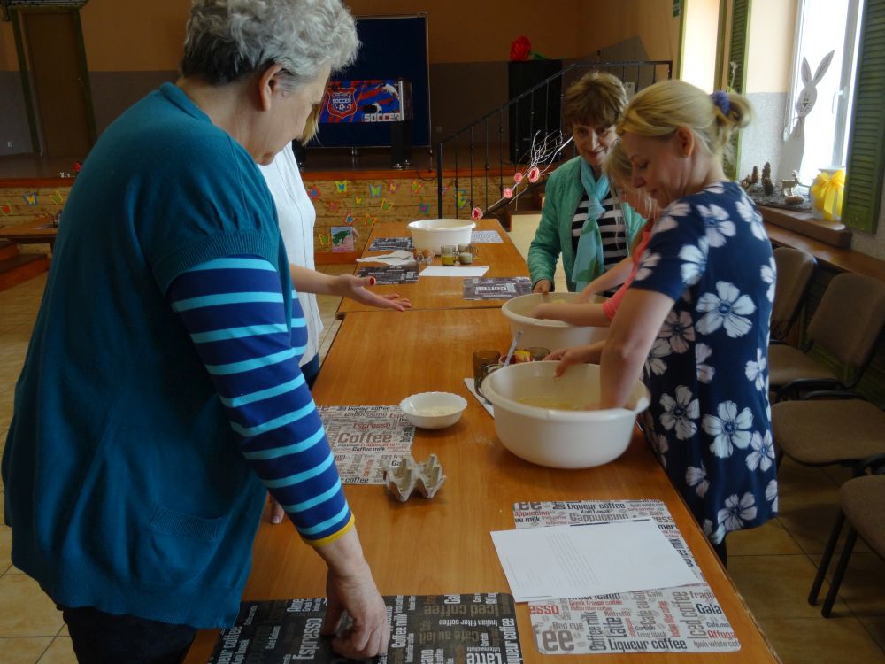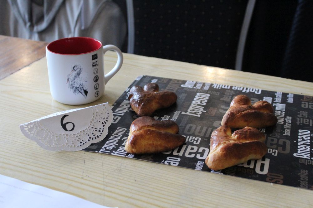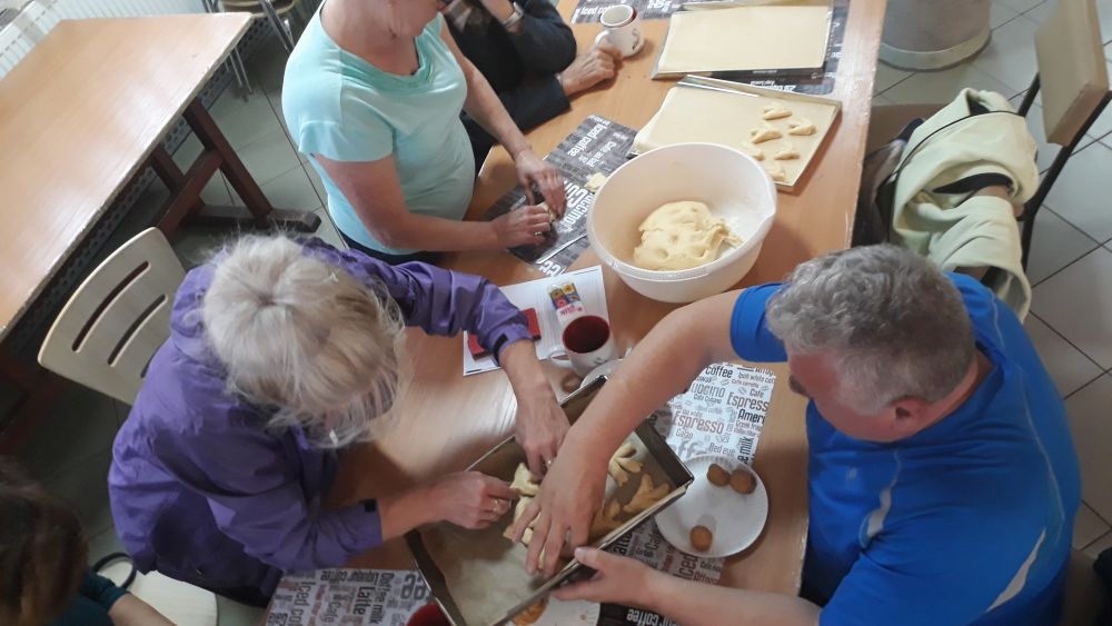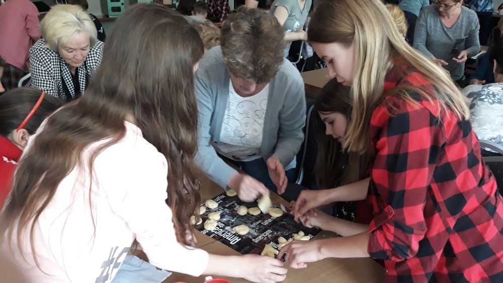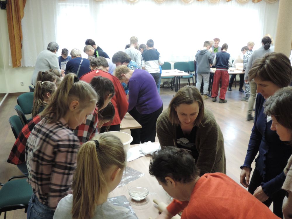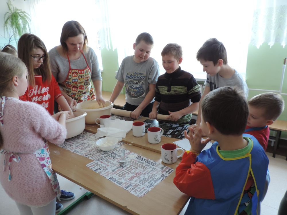 W tym roku, podobnie jak w poprzednim, zorganizowaliśmy 5 spotkań z mieszkańcami gmin objętych projektem w celu wspólnego pieczenia bocianich łap. Wszystkie spotkania bardzo się udały, cieszyły się dużym zainteresowaniem dorosłych i dzieci. Uczestnicy zapoznali się z zapomniana tradycją, którą było pieczenie drożdżowych bułek w kształcie czteropalczastej łapy bociana zwanych „busłowymi łapami”. W gwarze ludowej „busioł” oznaczał bociana. Ludzie wierzyli, że wkładając do gniazda „busłowe łapy”, zwabią ptaka znajdującego się na ich posesji, a dzięki temu szczęście i dostatek nie opuści ich przez cały rok. Gniazdo bocianie miało też chronić dom przed uderzeniem pioruna. Bułki piekło się 25 marca – w Kościele katolickim jest to ważne święto „Zwiastowania Najświętszej Marii Panny”. Dla każdego uczestnika mieliśmy upominek w postaci naszego projektowego kubka.