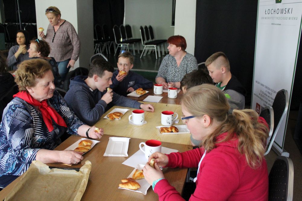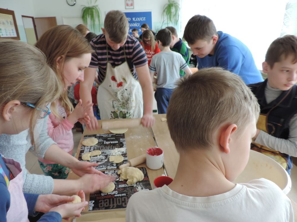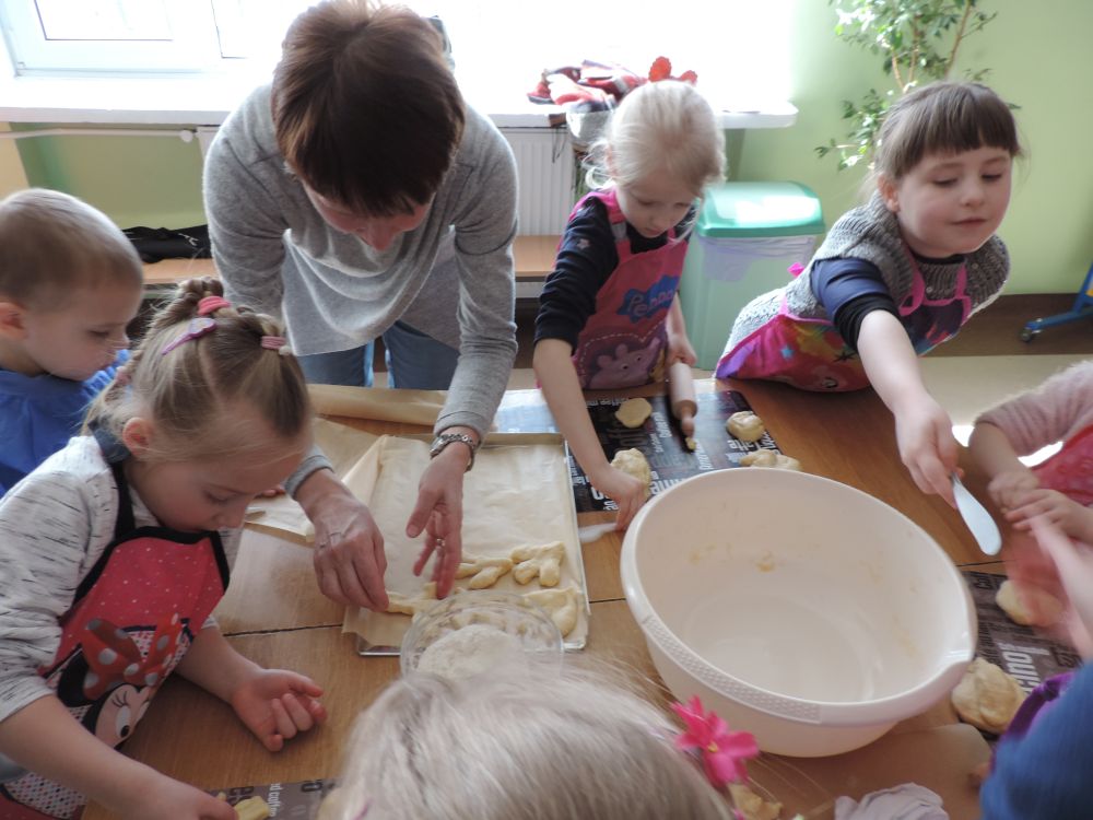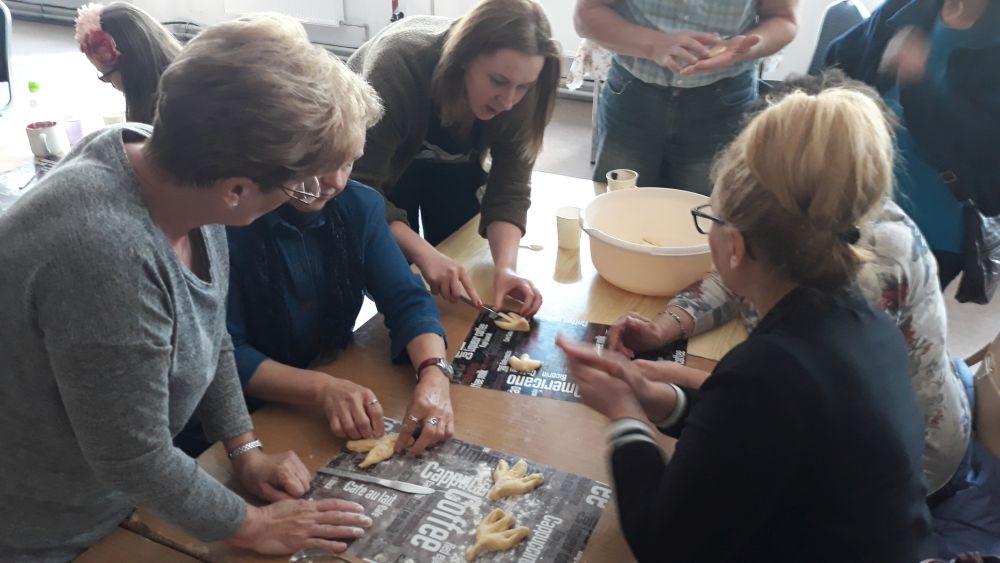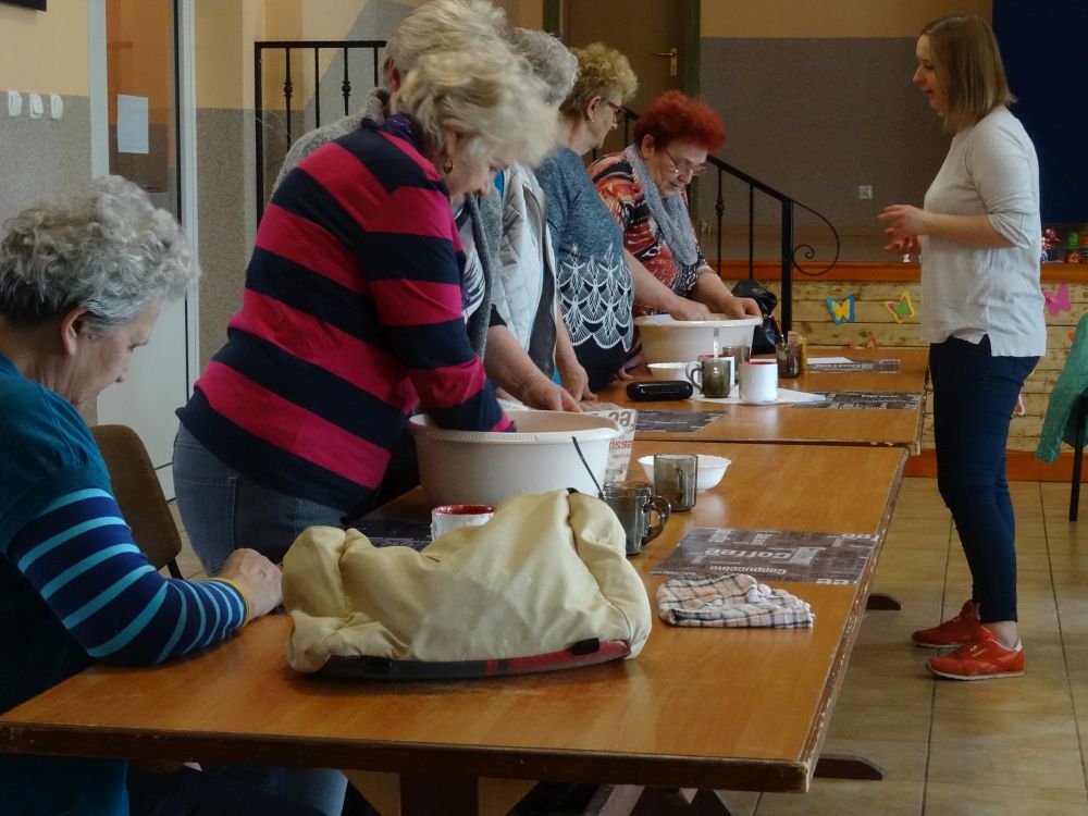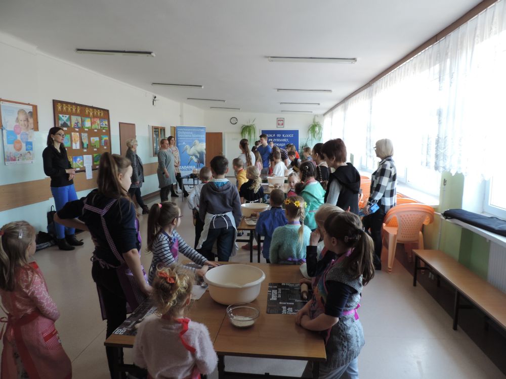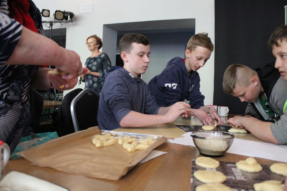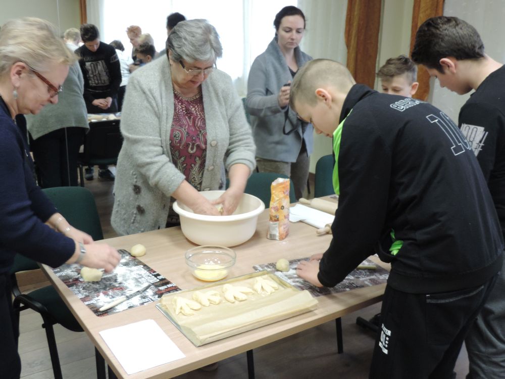 W tym roku, podobnie jak w poprzednim, zorganizowaliśmy 5 spotkań z mieszkańcami gmin objętych projektem w celu wspólnego pieczenia bocianich łap. Wszystkie spotkania bardzo się udały, cieszyły się dużym zainteresowaniem dorosłych i dzieci. Uczestnicy zapoznali się z zapomniana tradycją, którą było pieczenie drożdżowych bułek w kształcie czteropalczastej łapy bociana zwanych „busłowymi łapami”. W gwarze ludowej „busioł” oznaczał bociana. Ludzie wierzyli, że wkładając do gniazda „busłowe łapy”, zwabią ptaka znajdującego się na ich posesji, a dzięki temu szczęście i dostatek nie opuści ich przez cały rok. Gniazdo bocianie miało też chronić dom przed uderzeniem pioruna. Bułki piekło się 25 marca – w Kościele katolickim jest to ważne święto „Zwiastowania Najświętszej Marii Panny”. Dla każdego uczestnika mieliśmy upominek w postaci naszego projektowego kubka.