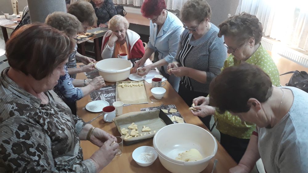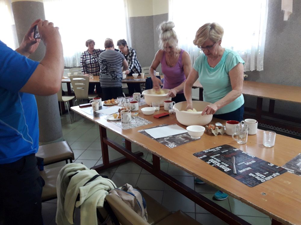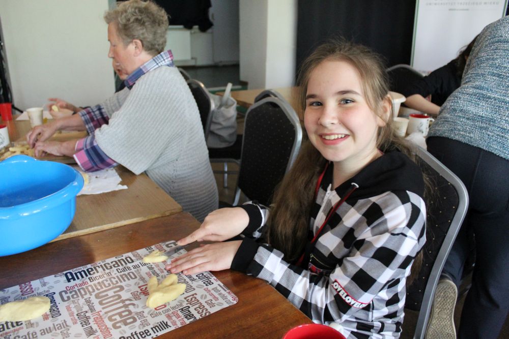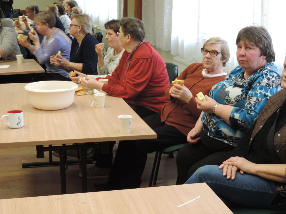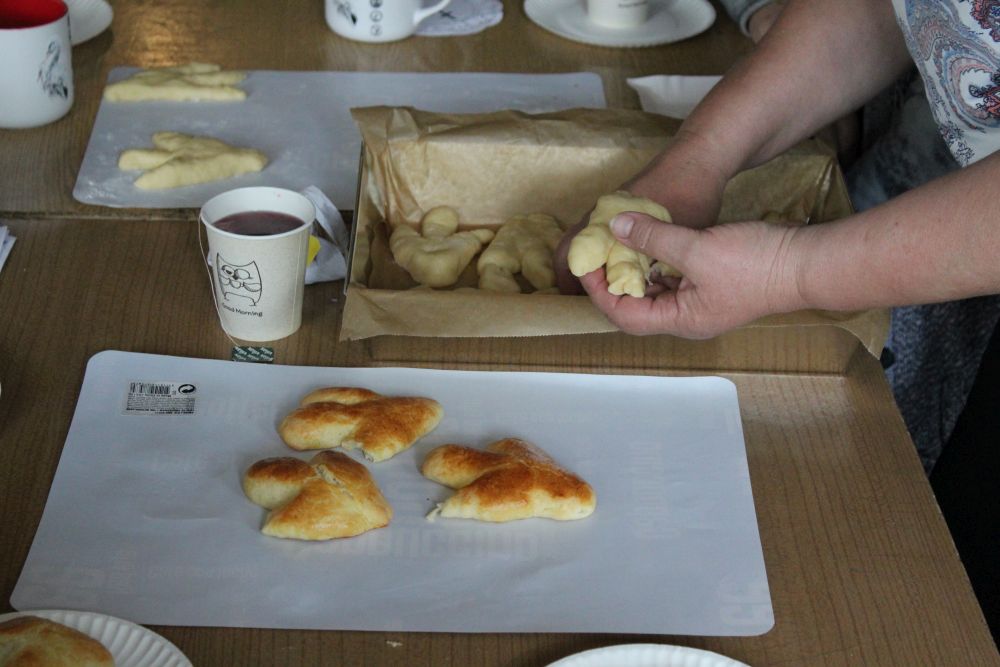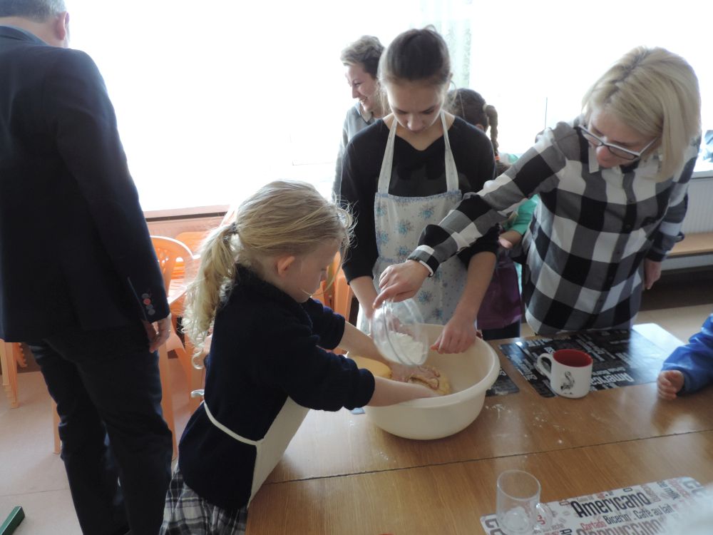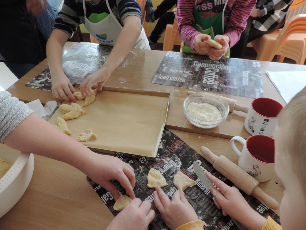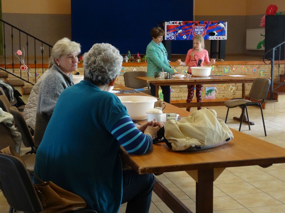 W tym roku, podobnie jak w poprzednim, zorganizowaliśmy 5 spotkań z mieszkańcami gmin objętych projektem w celu wspólnego pieczenia bocianich łap. Wszystkie spotkania bardzo się udały, cieszyły się dużym zainteresowaniem dorosłych i dzieci. Uczestnicy zapoznali się z zapomniana tradycją, którą było pieczenie drożdżowych bułek w kształcie czteropalczastej łapy bociana zwanych „busłowymi łapami”. W gwarze ludowej „busioł” oznaczał bociana. Ludzie wierzyli, że wkładając do gniazda „busłowe łapy”, zwabią ptaka znajdującego się na ich posesji, a dzięki temu szczęście i dostatek nie opuści ich przez cały rok. Gniazdo bocianie miało też chronić dom przed uderzeniem pioruna. Bułki piekło się 25 marca – w Kościele katolickim jest to ważne święto „Zwiastowania Najświętszej Marii Panny”. Dla każdego uczestnika mieliśmy upominek w postaci naszego projektowego kubka.