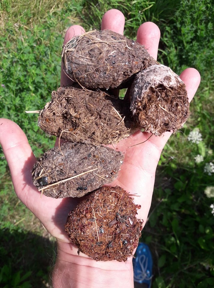 To wypluwki bocianów białych! Tak, są takie duże! A czym są? To zlepek niestrawionego i wydalonego pokarmu, głównie kości, sierści, piór i pancerzy chitynowych owadów. Widzicie te opalizujące fragmenty? To właśnie takie pokruszone pancerzyki chrząszczy.