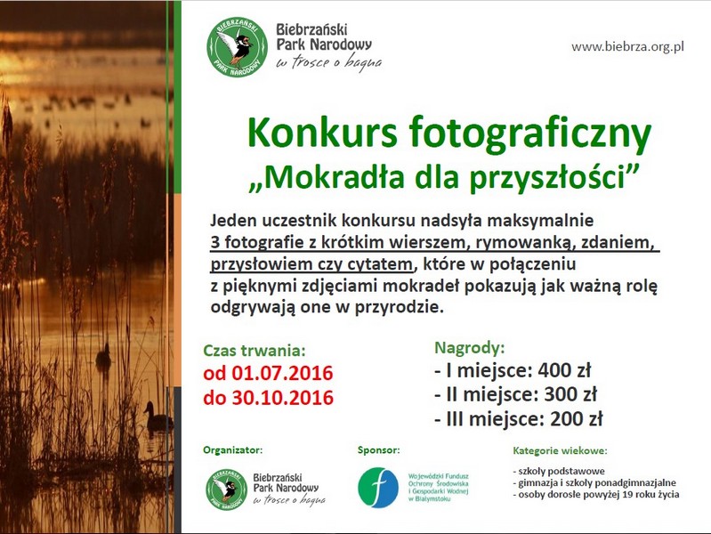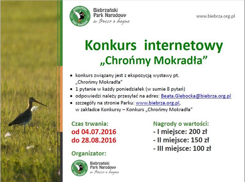 Pisaliśmy już o ogromnym znaczeniu obszarów wodno-błotnych w przyrodzie, przy okazji Światowego Dnia Mokradeł. Biebrzański Park Narodowy w tym roku chce zwrócić szczególną uwagę na tereny podmokłe, dlatego rok 2016 w Parku został ogłoszony "Rokiem Mokradeł". Z tej okazji ogłoszono ciekawe konkursy do których serdecznie zachęcamy. W pierwszym konkursie można błysnąć wiedzą o mokradłach odpowiadając na pytania konkursowe umieszczane w każdy poniedziałek na stronie Parku(www.biebrza.org.pl) w zakładce Konkursy – Konkurs „Chrońmy Mokradła”, a w drugim talentem artystycznym w dziedzinie fotografii. Szczegóły poniżej oraz na stronie Biebrzańskiego Parku Narodowego.