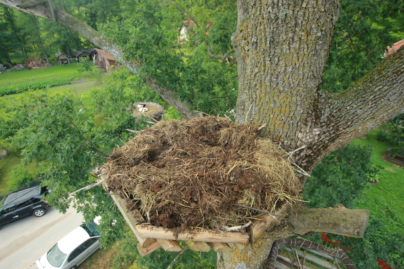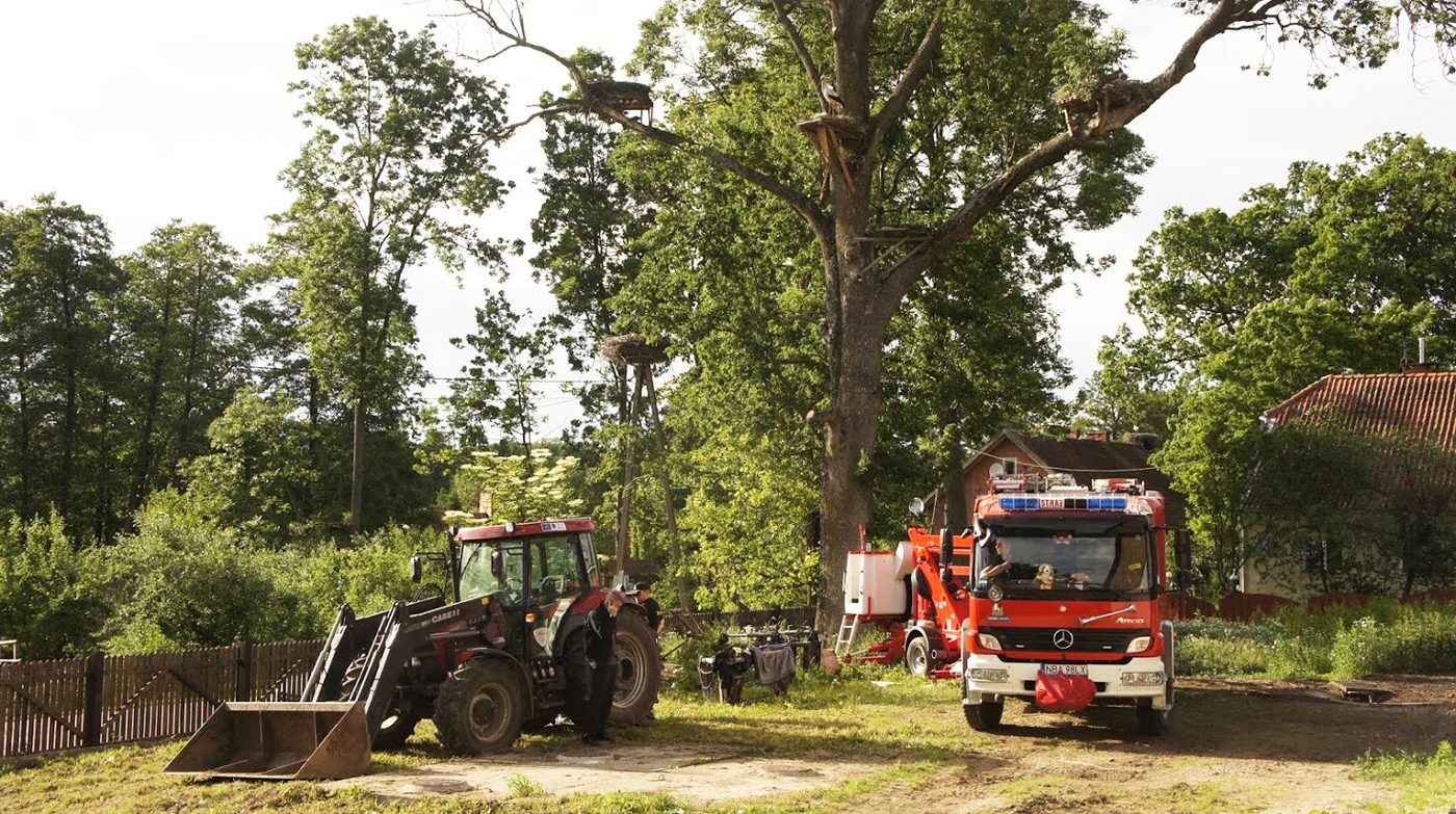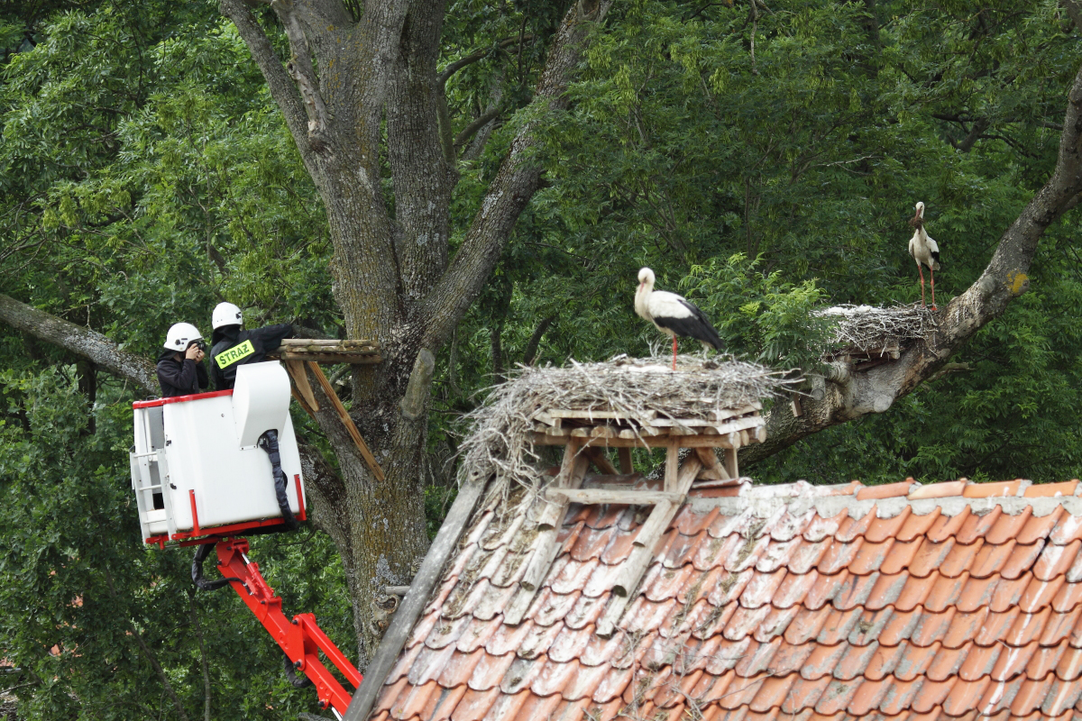 Już po kilku godzinach od zdarzenia, dorosłe bociany próbowały odbudować gniazdo, znosząc materiał na złamaną gałąź jesionu. Oczywiście próby kończyły się fiaskiem i materiał spadał na ziemię a widok dorosłego bociana stojącego na „kikucie” był przykry dla wszystkich mieszkańców Żywkowa. Z tego też powodu, za namową naszego sąsiada Pana Władysława Andrejew, postanowiliśmy jak najszybciej odbudować gniazdo, aby bociany nie porzuciły stanowiska i wróciły do nas w przyszłym roku. Na ponowne składanie jaj bowiem było już zdecydowanie za późno. Dwa dni po upadku gniazda, udało się odbudować gniazdo. Na miejsce przyjechali strażacy z OSP Kamińsk z podnośnikiem, zakupionym przez RDOŚ w ramach projektu ochrony bociana Life+. Wspólnie ze strażakami zamontowaliśmy platformę i ułożyliśmy materiał ze starego gniazda. Już po 5 minutach od zakończonej pracy bocian wylądował na gnieździe i zaczął poprawiać materiał gniazdowy. Ptaki cały wieczór intensywnie donosiły gałęzie i siano, co dobrze wróżyło na przyszły rok.