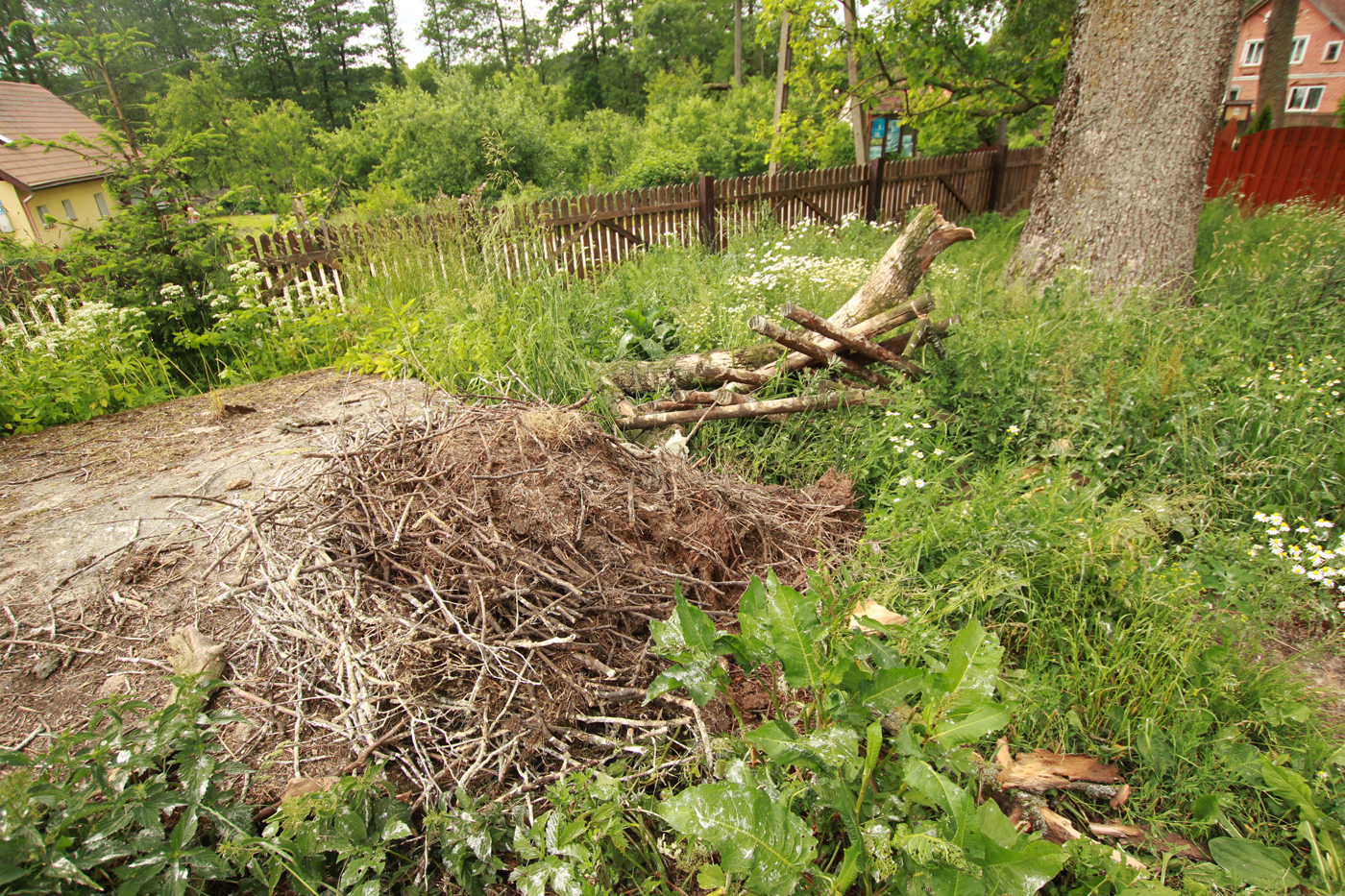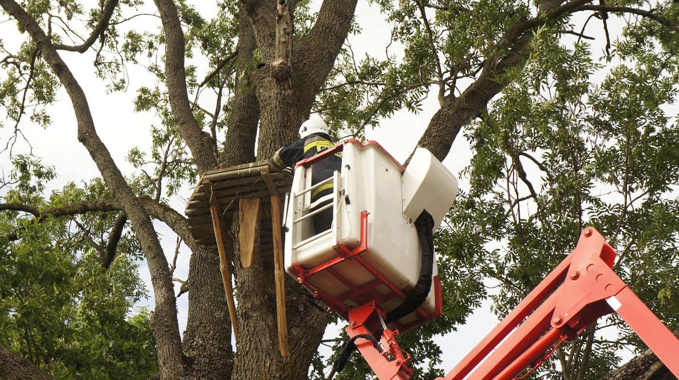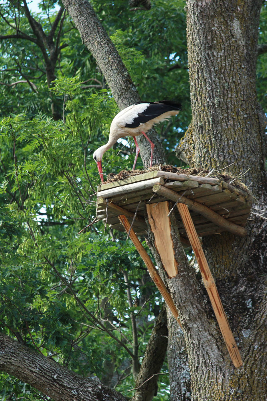 Już po kilku godzinach od zdarzenia, dorosłe bociany próbowały odbudować gniazdo, znosząc materiał na złamaną gałąź jesionu. Oczywiście próby kończyły się fiaskiem i materiał spadał na ziemię a widok dorosłego bociana stojącego na „kikucie” był przykry dla wszystkich mieszkańców Żywkowa. Z tego też powodu, za namową naszego sąsiada Pana Władysława Andrejew, postanowiliśmy jak najszybciej odbudować gniazdo, aby bociany nie porzuciły stanowiska i wróciły do nas w przyszłym roku. Na ponowne składanie jaj bowiem było już zdecydowanie za późno. Dwa dni po upadku gniazda, udało się odbudować gniazdo. Na miejsce przyjechali strażacy z OSP Kamińsk z podnośnikiem, zakupionym przez RDOŚ w ramach projektu ochrony bociana Life+. Wspólnie ze strażakami zamontowaliśmy platformę i ułożyliśmy materiał ze starego gniazda. Już po 5 minutach od zakończonej pracy bocian wylądował na gnieździe i zaczął poprawiać materiał gniazdowy. Ptaki cały wieczór intensywnie donosiły gałęzie i siano, co dobrze wróżyło na przyszły rok.