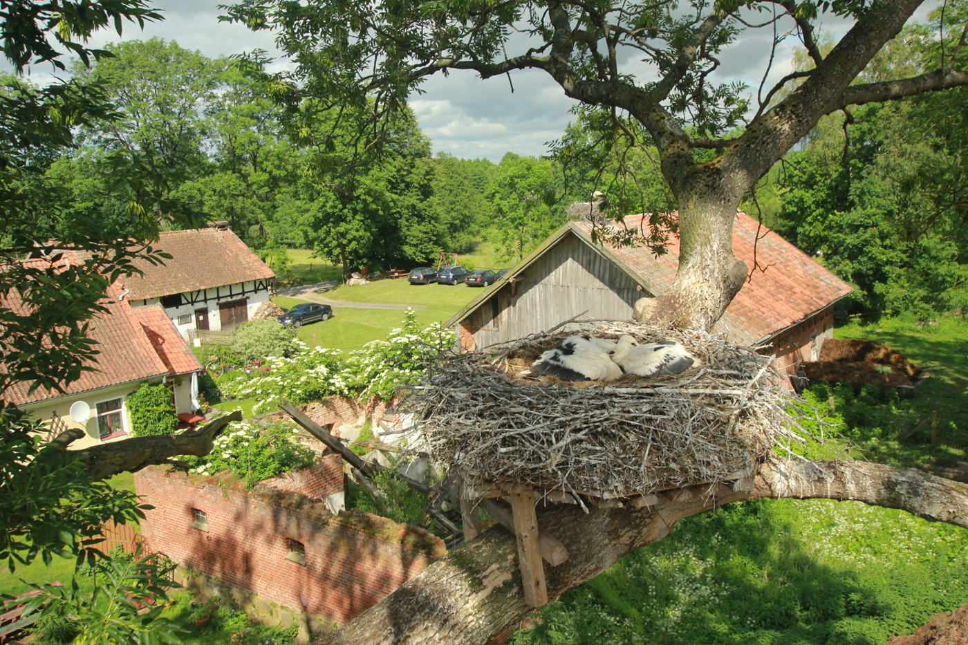 Piątek 13-tego czerwca 2014 roku okazał się pechowy dla pary bocianów z naszego gospodarstwa w Żywkowie. Gałąź, na której było posadowione gniazdo, nie wytrzymała naporu wiatru i pękła. Gniazdo spadło na ziemię z takim hukiem, że od razu na miejsce zbiegli się mieszkańcy Żywkowa. Niestety dwa młode bociany nie przeżyły upadku a trzeci trafił do Ośrodka Rehabilitacji Ptaków Dzikich w Bukwałdzie (prowadzonego przez Fundację Albatros) z połamanymi skrzydłami, pękniętą żuchwą i obrażeniami wewnętrznymi. Na szczęście, dzięki pomocy Pani Marii Duchnik z Urzędu Gminy w Górowie Iławeckim, która zorganizowała „gminny” transport, bociek trafił na stół operacyjny zaledwie kilka godzin po tragicznym wypadku. Trzymamy kciuki za udaną rehabilitację i powrót do natury.