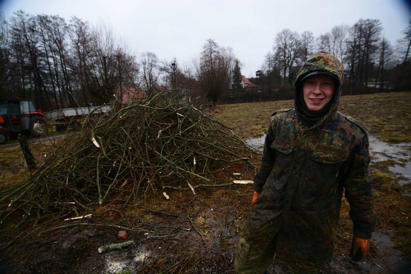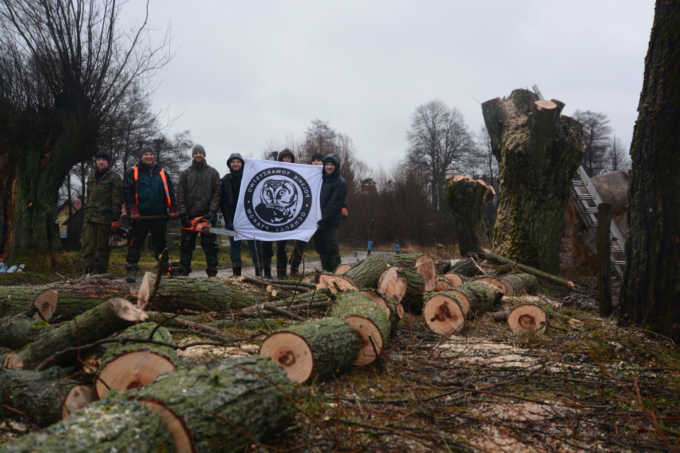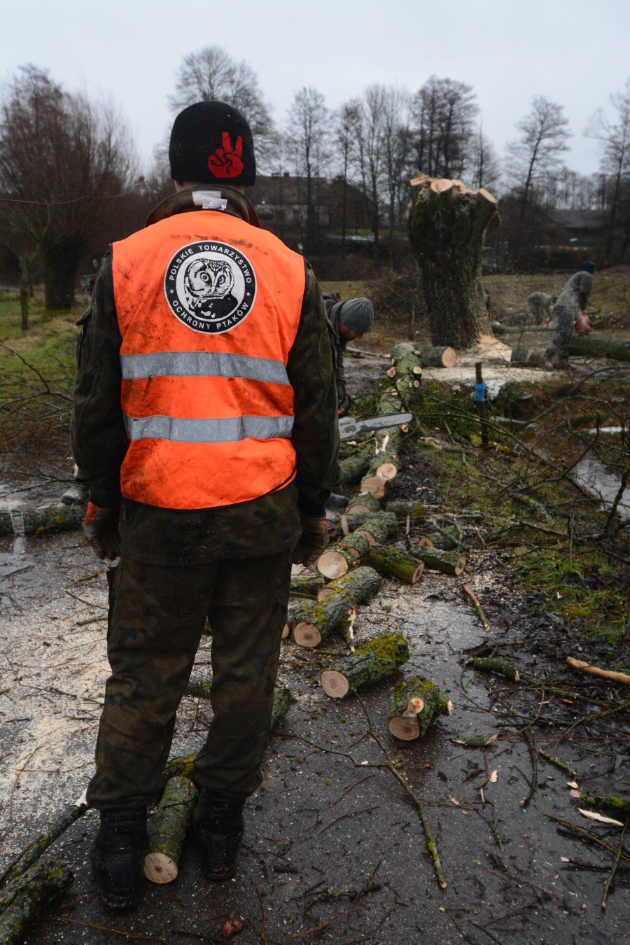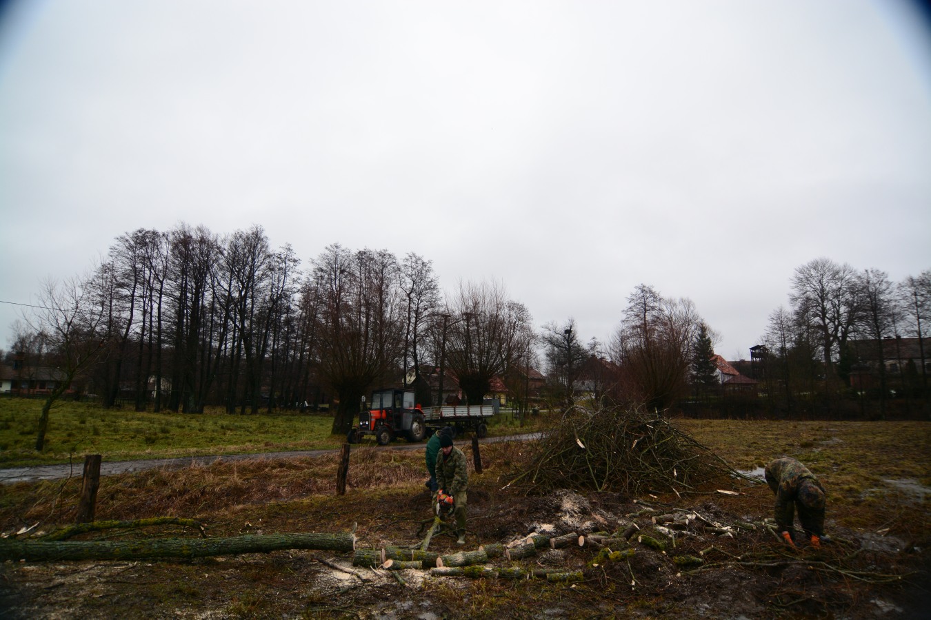 To była akcja dla prawdziwych twardzieli. Nie padało przez pierwsze 3 godziny a potem... szkoda gadać, ale udało się! Ogłowiliśmy 4 wierzby, co stanowi 133% planu! Na akcję wolontariusze zjechali się już w piątek, aby można było spokojnie pogadać przy herbacie i waflu (dziękujemy Lucjan, były pyszne!). Rano po pysznym śniadaniu, które stanowiła jajecznica ze świeżych jaj od żywkowskich kur grzebiących, ruszyliśmy do pracy. Początkowo szło dość opornie, ale już po kilku chwilach nabraliśmy wprawy i gałąź za gałęzią... ogłowiliśmy 4 wierzby. Drewno od razu było wrzucane na przyczepę i wywożone do gospodarstwa właścicieli wierzb. W akcji uczestniczyło 10 mężczyzn + 2 kobiety donoszące herbatę i ciasto oraz Pliszka :) Podczas pracy nad naszymi głowami od rana ciągnęły z Obwodu Kaliningradzkiego na wysypisko (takie są domysły) mewy srebrzyste, których naliczyliśmy min. 500 os. Po południu z kolei wracały w stronę Zalewu Wiślanego. Akcję zaliczamy do trudnych, ale udanych. Dziękuję wszystkim, którzy nie zrazili się pogodą i przyjechali. Dziękuję też Tadziowi za zdjęcia. Mam nadzieję, do zobaczenia niebawem na kolejnym czynie. Sebastian Menderski