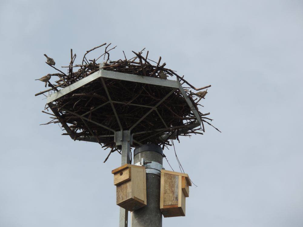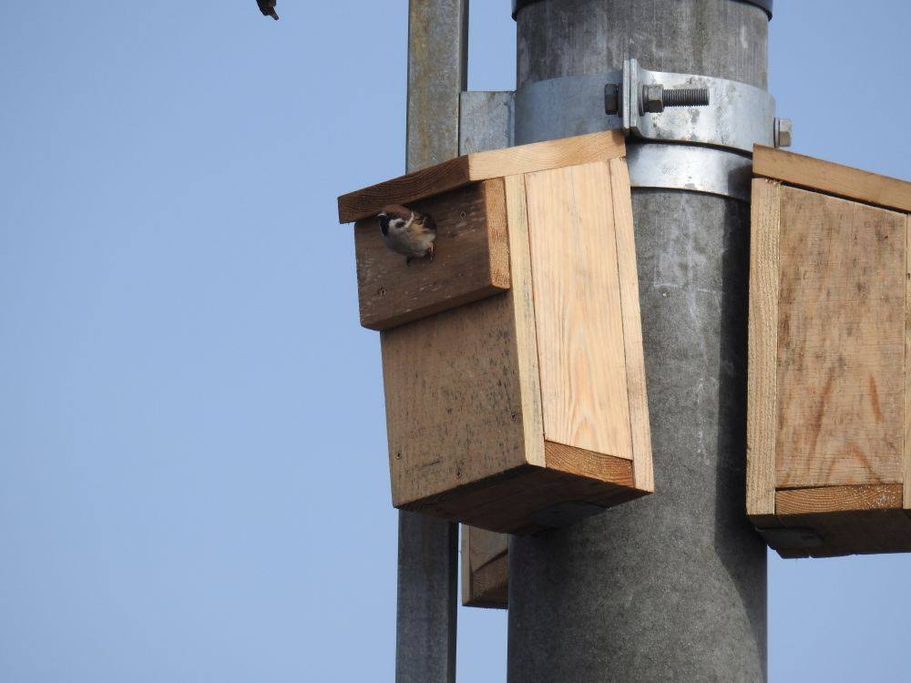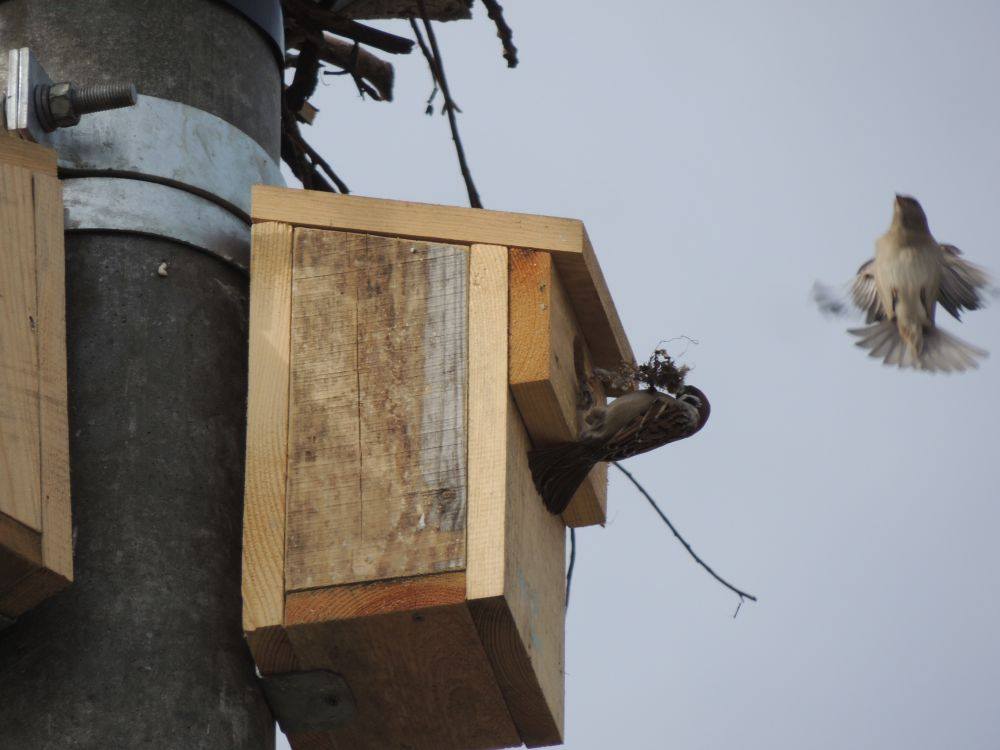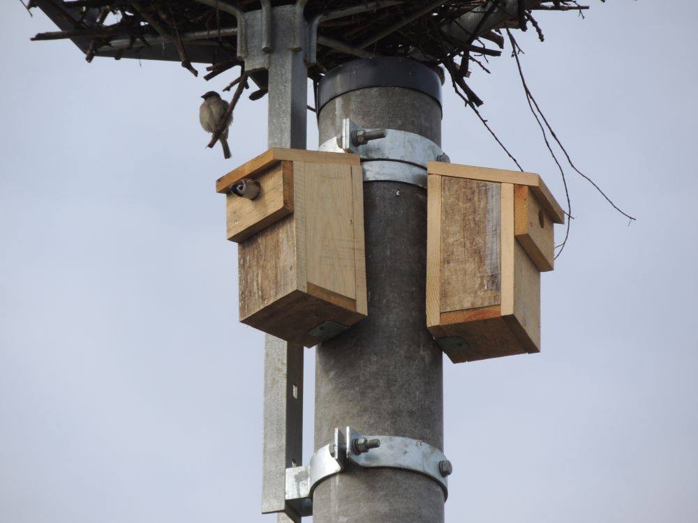 W ramach projektu ochrony bociana białego finansowanego ze środków Life, w celu zrekompensowania utraconych miejsc gniazdowania wróbli i mazurków postanowiliśmy pod każdym przeniesionym gniazdem montować 3 skrzynki lęgowe. Skąd ta liczba? Otóż kilka lat temu przeprowadziliśmy badania zasiedlenia gniazd bociana białego przez inne gatunki ptaków i okazało się, że ich głównymi mieszkańcami są wróble, mazurki i szpaki. Na jedno gniazdo przypadało średnio 3,5 pary. Pod koniec marca skontrolowaliśmy kilka z tych budek. Bocianów jeszcze nie było na gniazdach, ale wszystkie skrzynki miały już swoich lokatorów! Potwierdza, to, że jest to potrzebny i ważny element ochrony tych drobnych ptaków wróblowych. Zjawisko to zamierzamy zbadać dogłębniej.