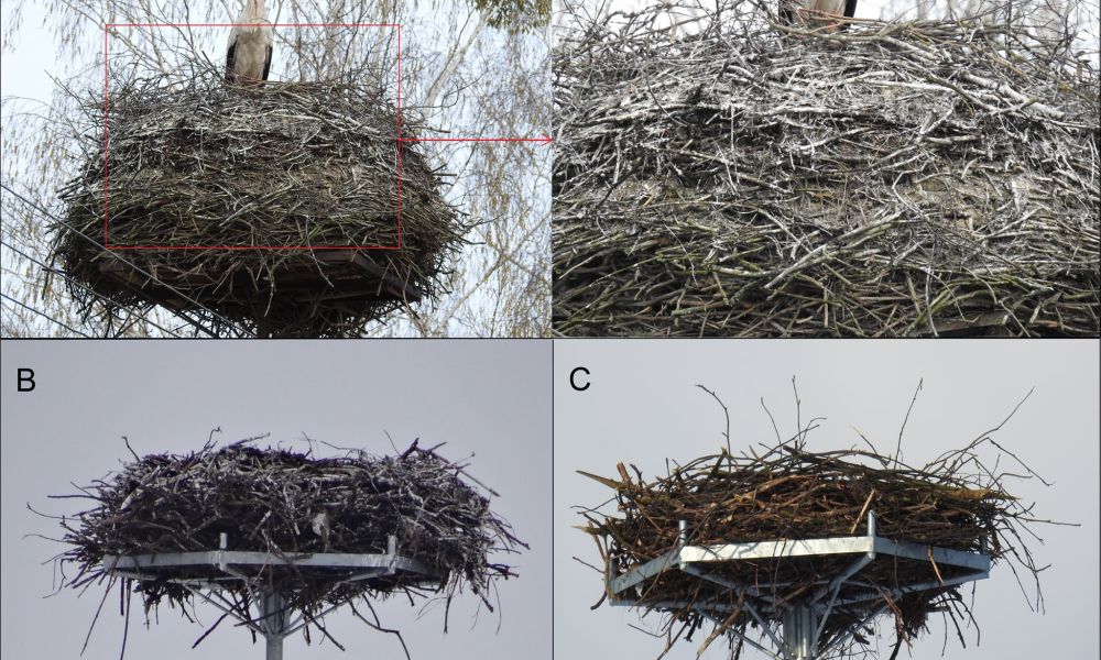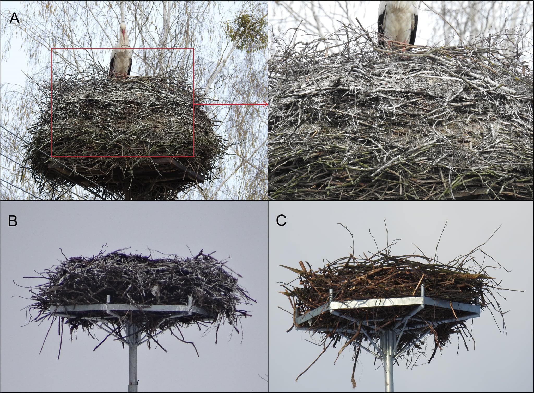 Fot. A – gniazdo obielone odchodami przez bociana zaraz po przylocie z zimowiska, B – przeniesione gniazdo na słup wolnostojący i obielone wapnem sadowniczym, C – przeniesione gniazdo na słup wolnostojący bez bielenia (Adam Zbyryt).