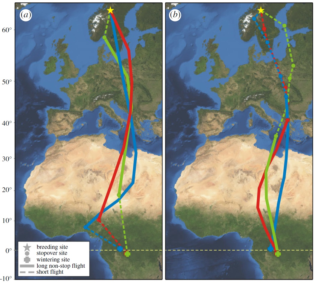 Rysunek 1. Jesienna (a) i wiosenna (b) migracja trzech osobników dubelta. Źródło: Raymond H. G. Klaassen et al. Great flights by great snipes: long and fast non-stop migration over benign habitats. Biol. Lett. 2011
