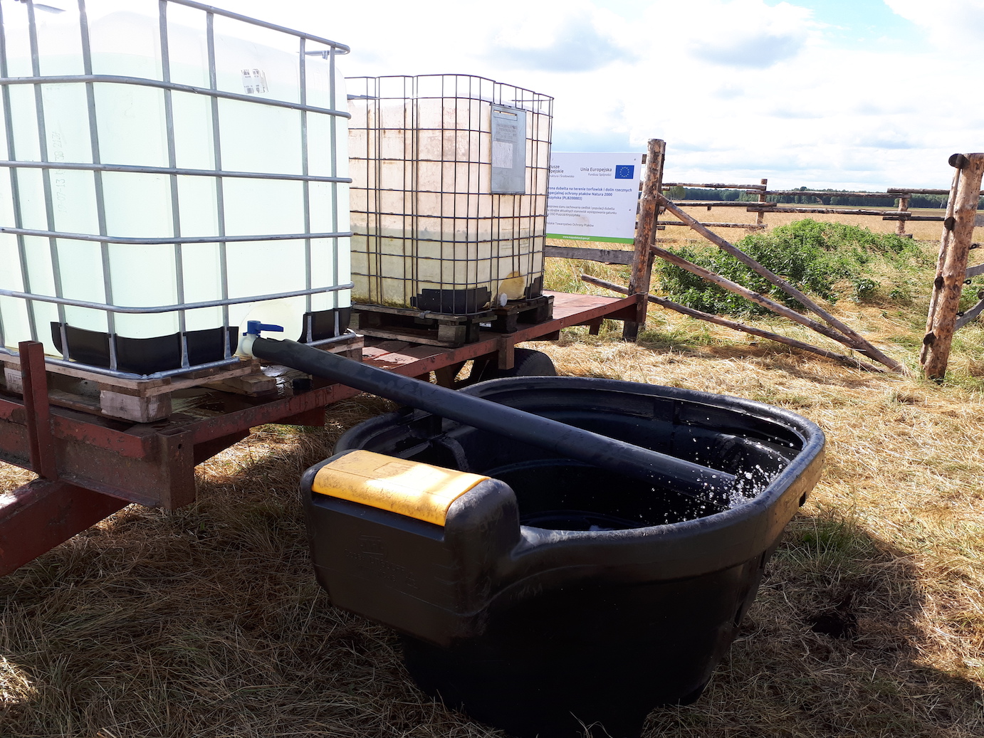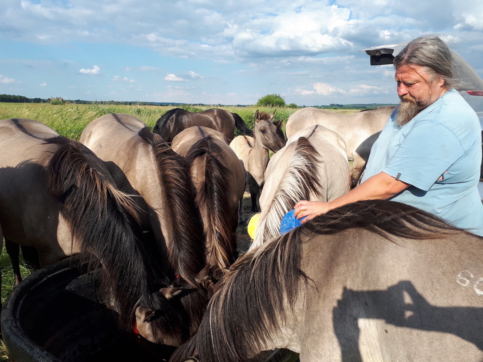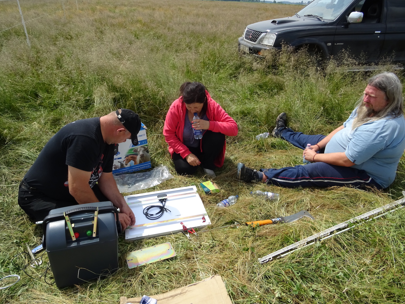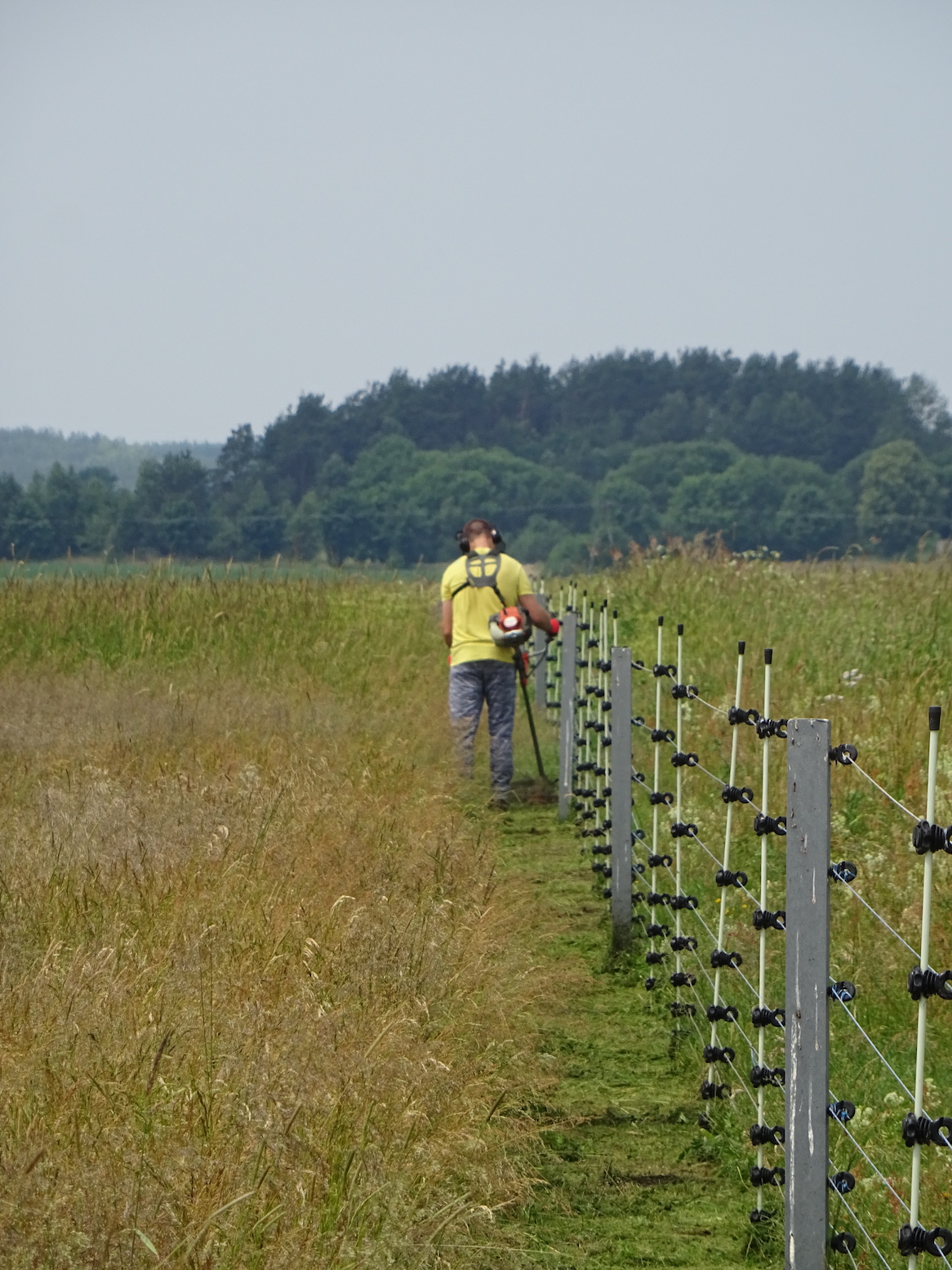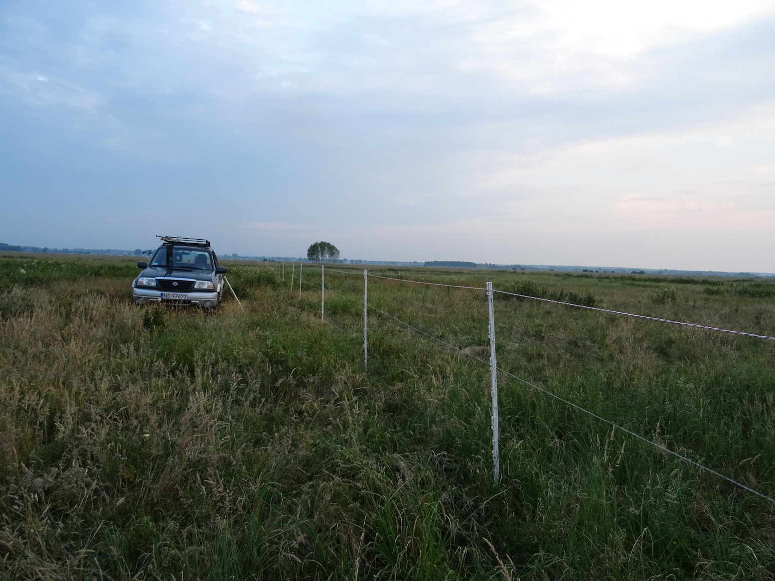 Na sam początek wzięliśmy się za przywiezienie poidła dla koników polskich oraz stawianie ogrodzenia, dzielącego powierzchnię działki na dwie kwatery. Naszym celem było zabezpieczenie stwierdzonych stanowisk gniazdowych ptaków siewkowych przed ewentualnym zdeptaniem przez koniki polskie, które następnego dnia zawitały na kwaterę. W ciągu 5 godzin postawiliśmy blisko 700 m. elektrycznego ogrodzenia. Kolejny dzień minął nam na podłączaniu nowego ogrodzenia pod prąd, przywożeniu ekipy wypasowej (tj. 7 klaczy wraz z 2 źrebakami i pilnującego całego stada ogiera) z Kalitnika, uzupełnianiu wody w poidle (a nie tak łatwo uzupełnić 500 litrowe poidło, gdy w pobliżu brak studni), podkaszaniu trawy wzdłuż ogrodzenia, a następnie, już w Kalitniku, na naprawie drewnianego ogrodzenia dla koni. W środę odpoczywaliśmy od pracy w terenie, w zamian skupiliśmy się na pracach porządkowych w Stacji Terenowej PTOP w Kalitniku. Następne dni to powrót do prac na Gródku, dalsze podkaszanie trawy wzdłuż płotu oraz uzupełnianie wody w poidle.