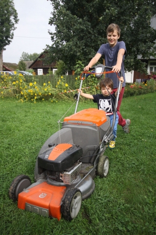 Najmłodsi uczestnicy spotkania zajęli się tym razem koszeniem trawy wokół domu i innych budynków gospodarczych.