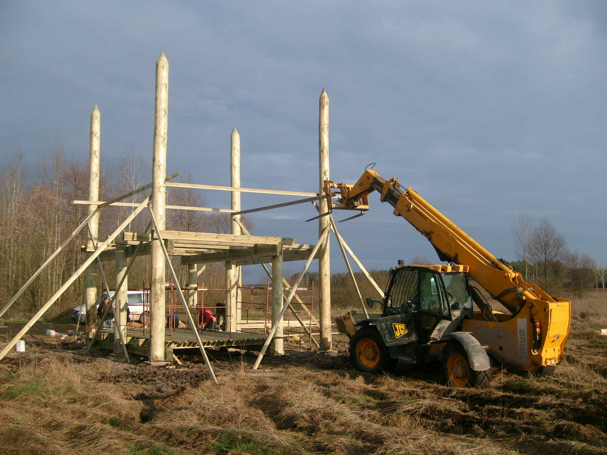 Prezentujemy najnowsze zdjęcie z kolejnego etapu budowy wieży widokowej, która jest powstaje w sąsiedztwie naszej Stacji Terenowej w Kalitniku. Konstrukcja prezentuje się bardzo solidnie, Dolny poziom, jak wcześniej pisaliśmy, będzie spełniał funkcję brogu - miejsca na składowanie siana, dlatego zaprojektowano tu ażurową, przewiewną podłogę. Na poziom drugi, czyli właściwą platformę obserwacyjną będą wiodły solidne schody. Całość zwieńczy stylowy dach z wystającymi zaostrzonymi słupami. Mamy nadzieję, że będą one dogodnym miejscem dla czatujących na zdobycz, okolicznych orlików krzykliwych.