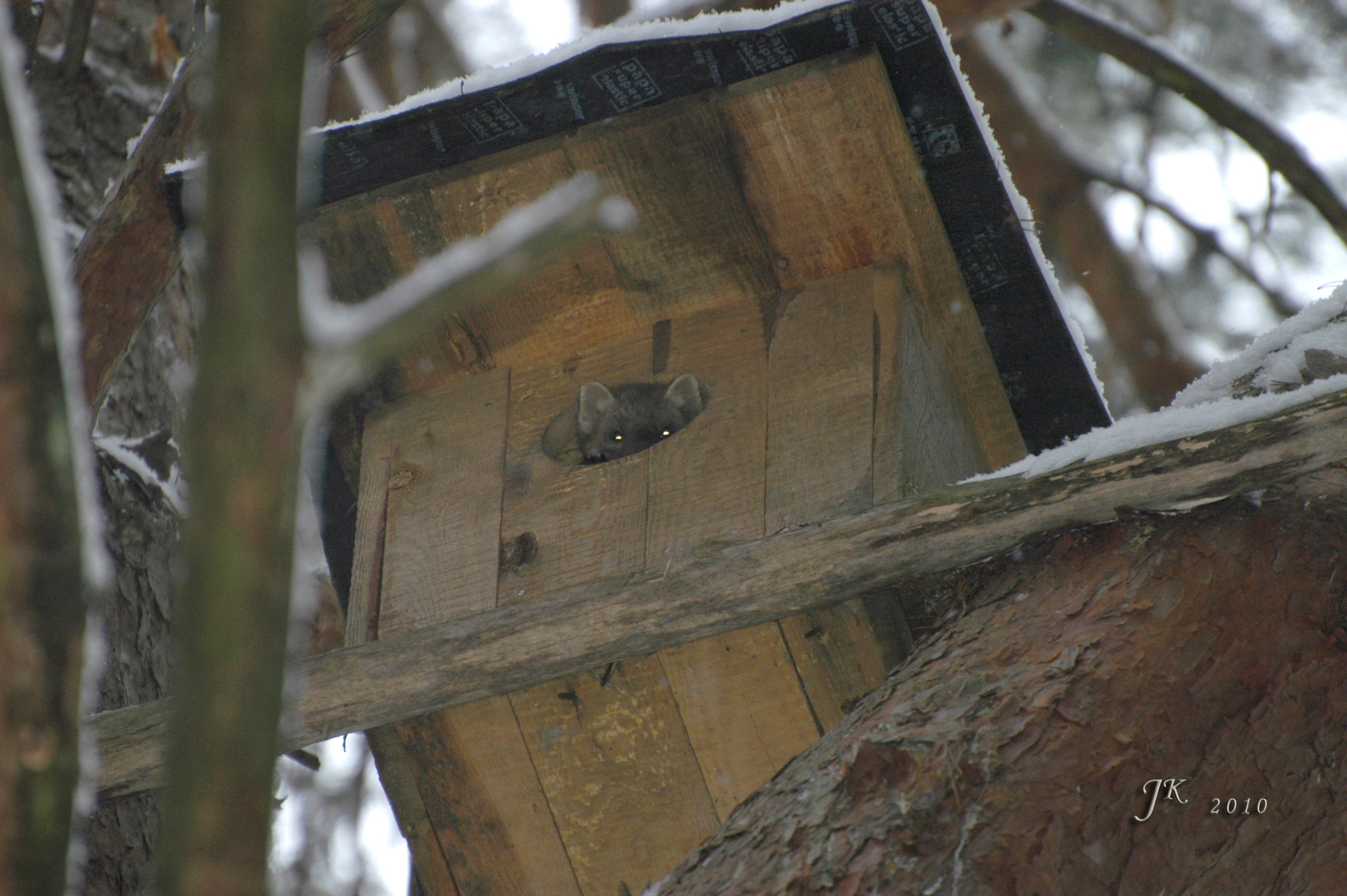 Zdjęcie nr 1. Skrzynka dla puszczyka zajęta przez kunę.