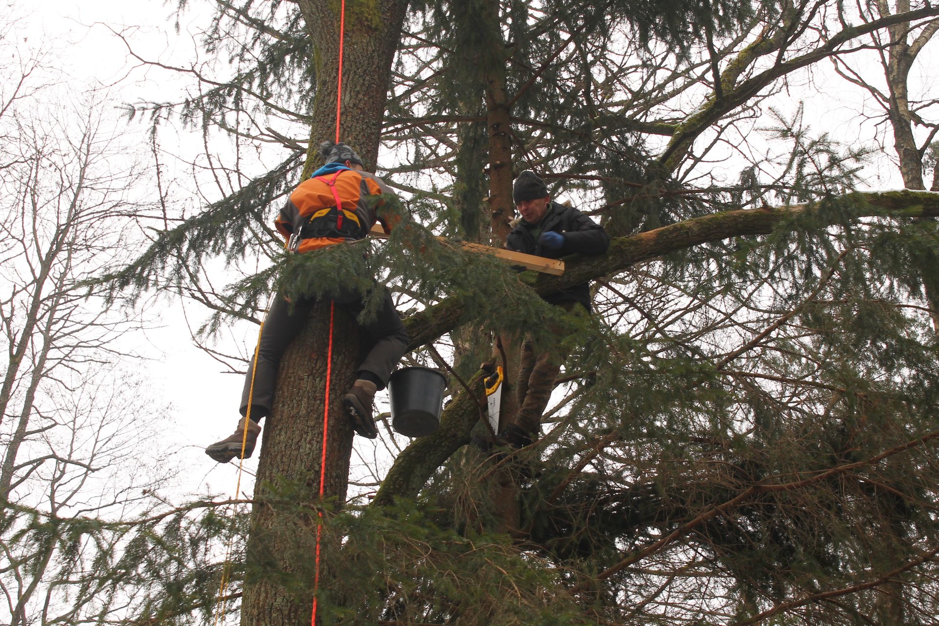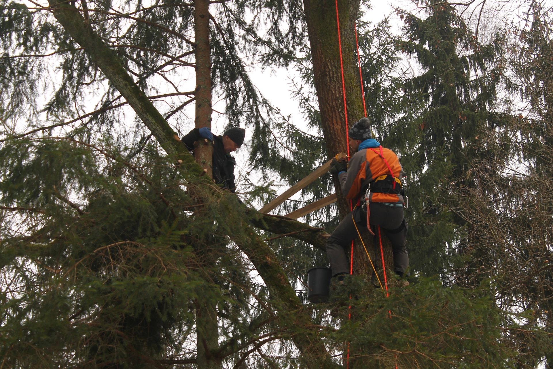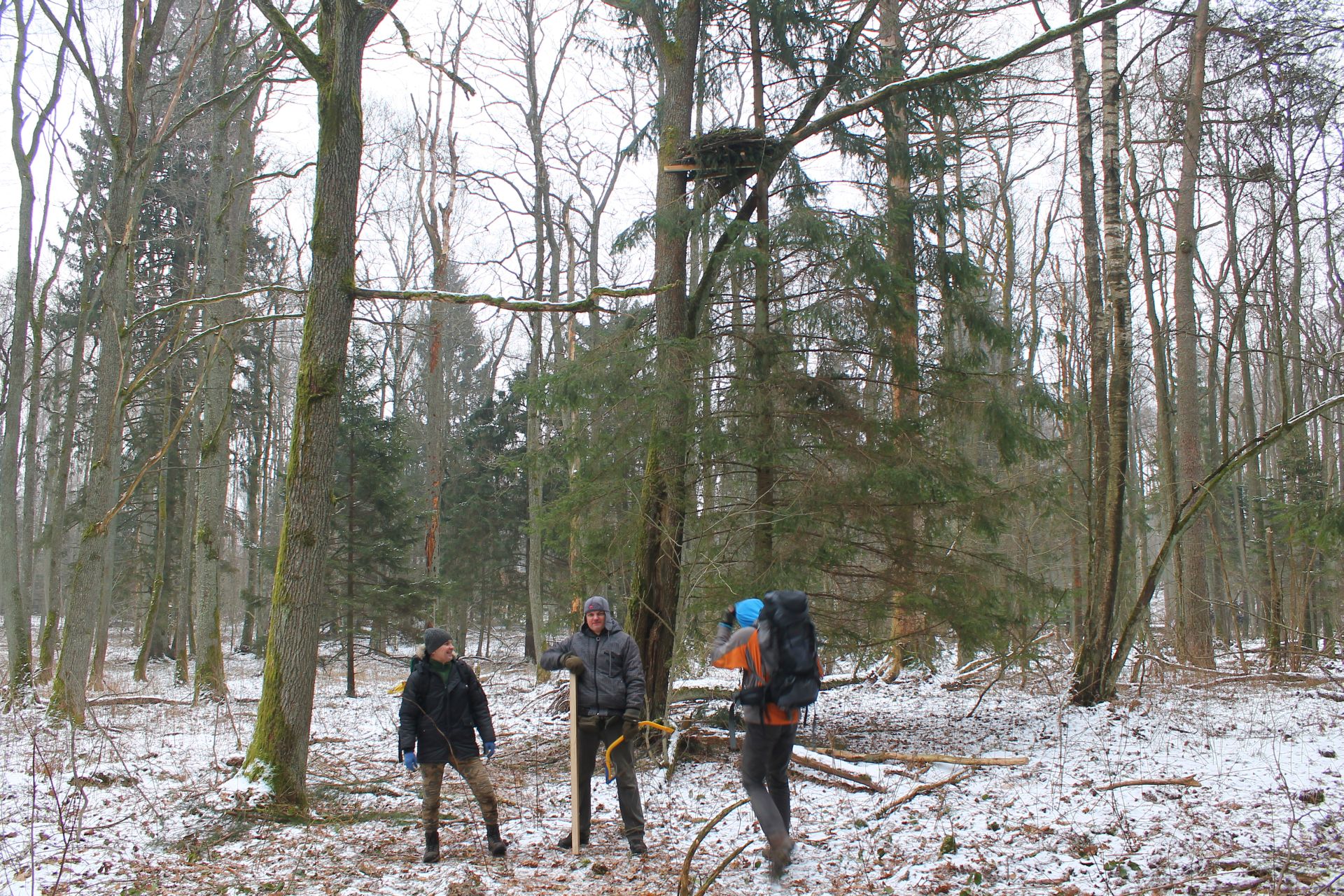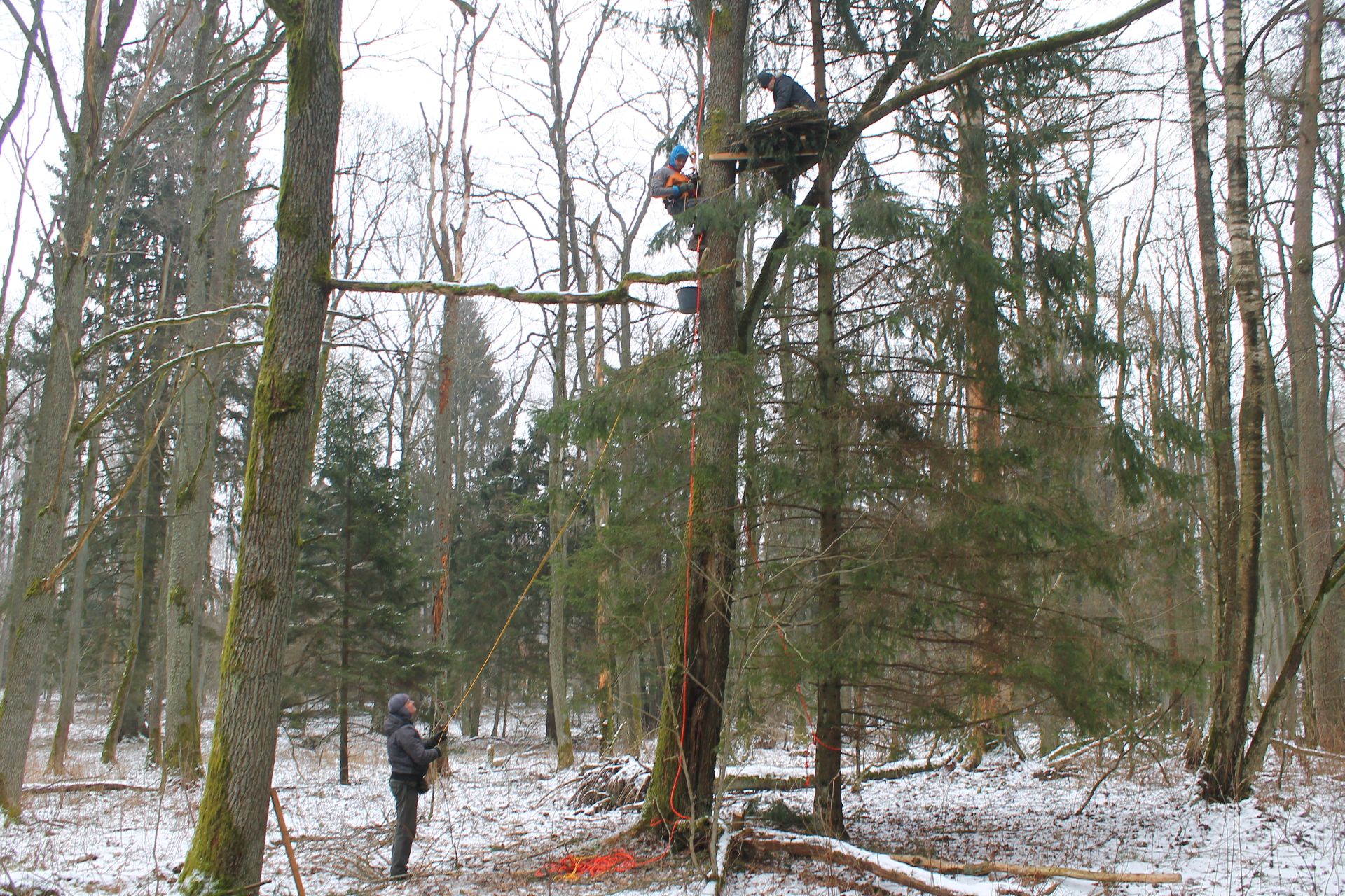 W ramach projektu ochrony ptaków strefowych zaplanowaliśmy budowę 10 platform gniazdowych dla bociana czarnego. Platformy będą wybudowane tam, gdzie bocianom nie poszczęściło się w ostatnich latach i ich gniazdo spadło. Budowa gniazd dla bocianów czarnych to nie lada wyzwanie. Niezbędny jest do tego sprzęt alpinistyczny. Podstawę gniazda stanową żerdzie natomiast pozostała masa gniazdowa zbudowana jest z materiału miejscowego tj gałęzi i mchu. Zdjęcia prezentowane poniżej pokazują budowę gniazda w Ostoi Warmińskiej.