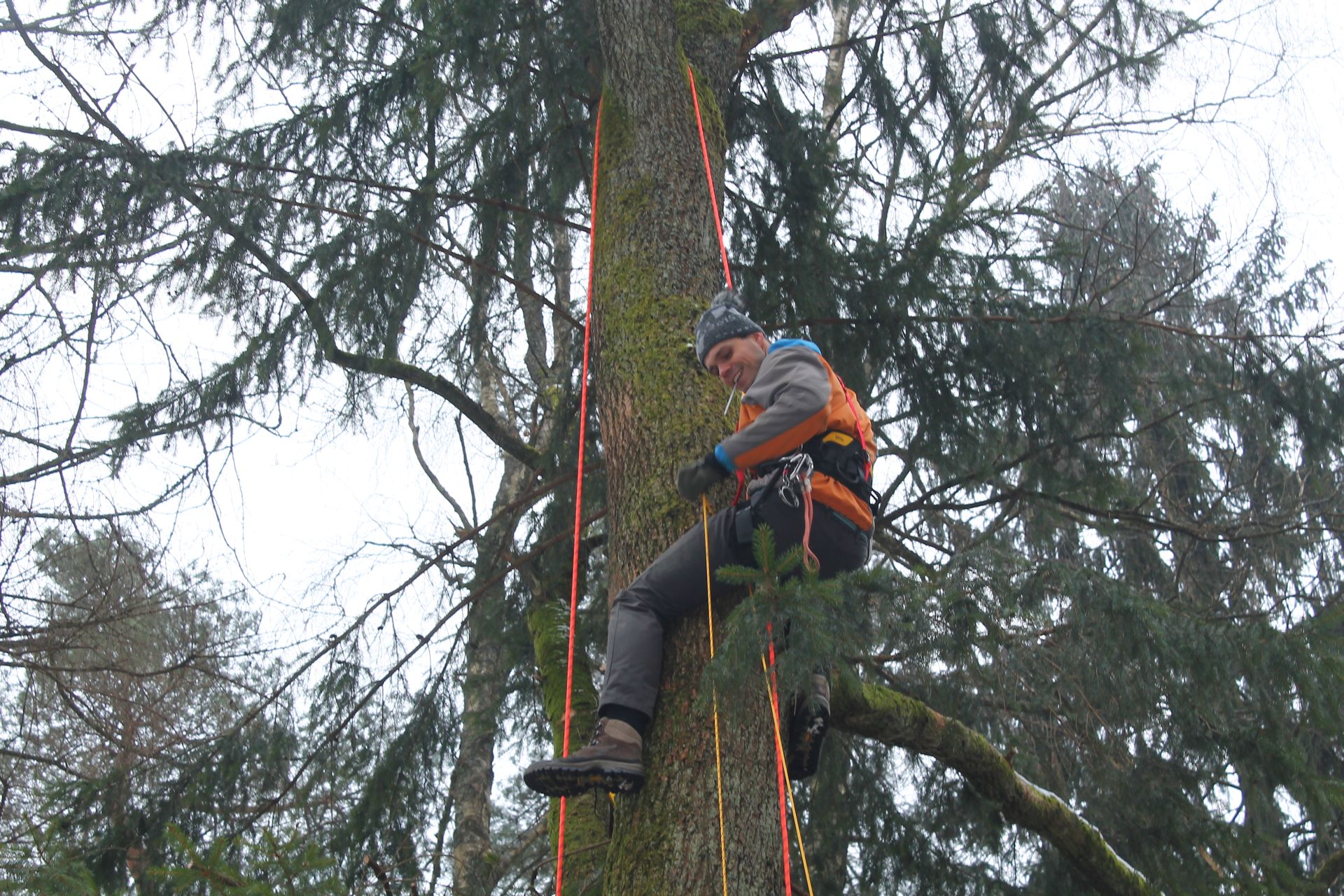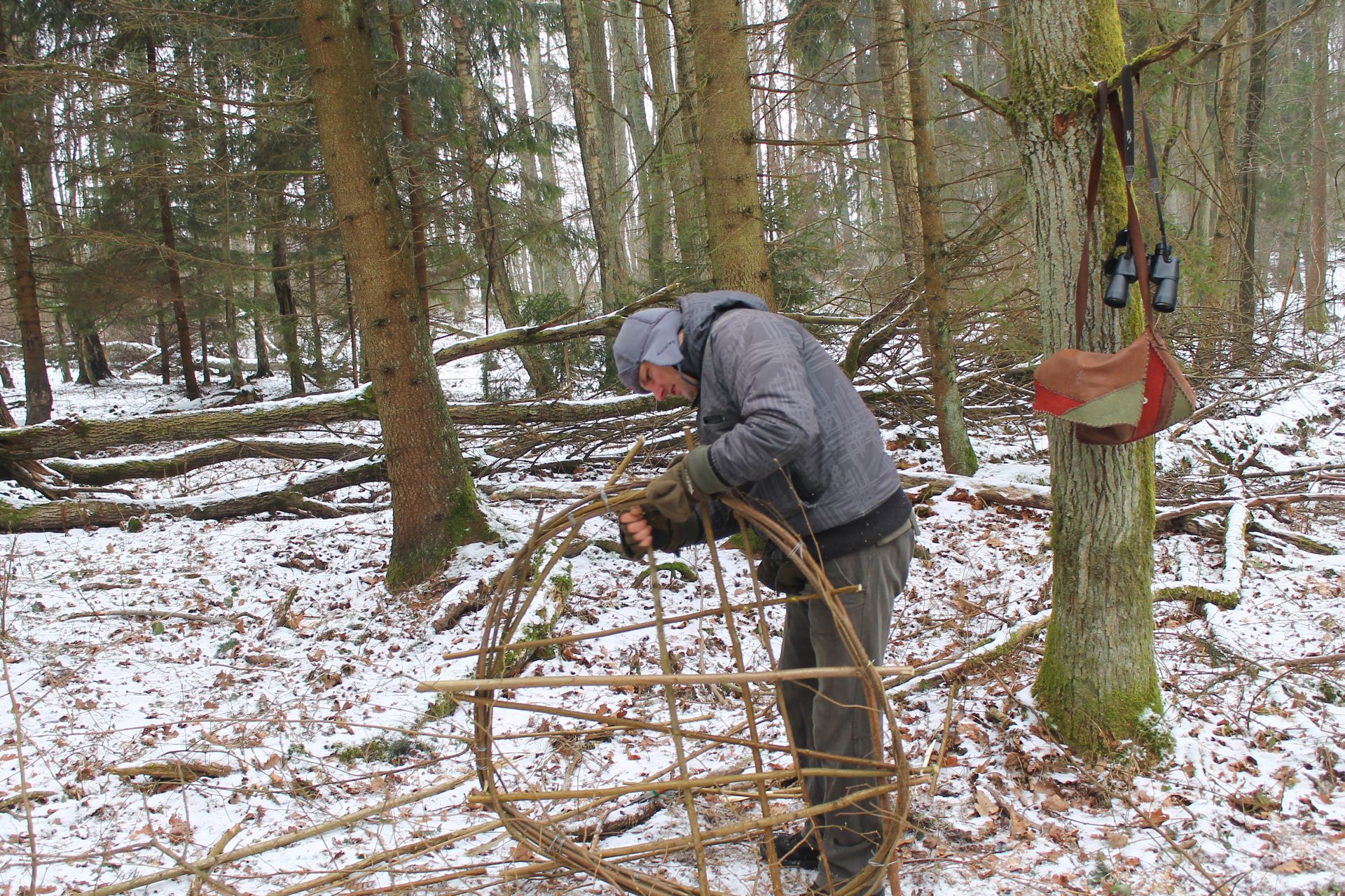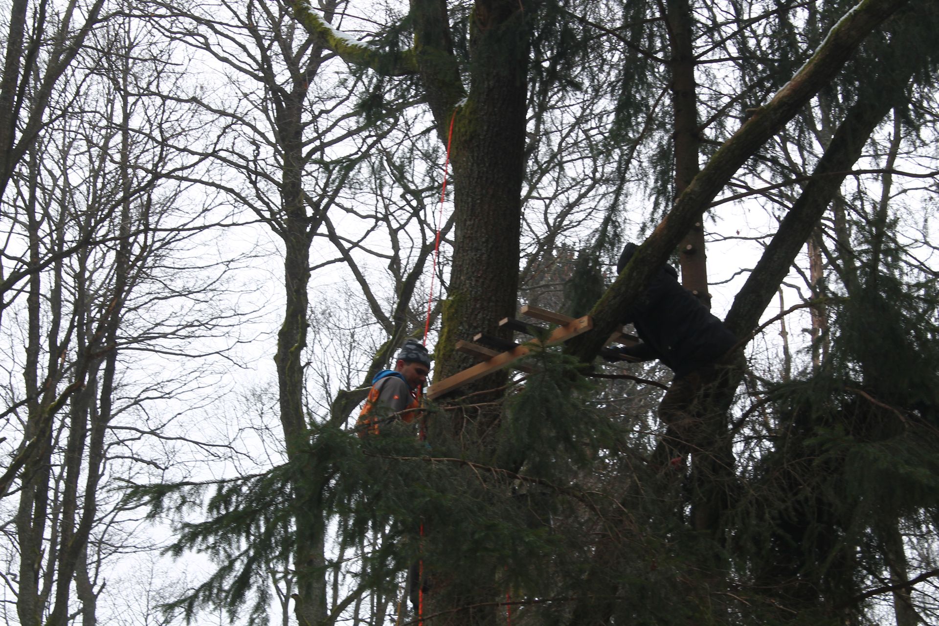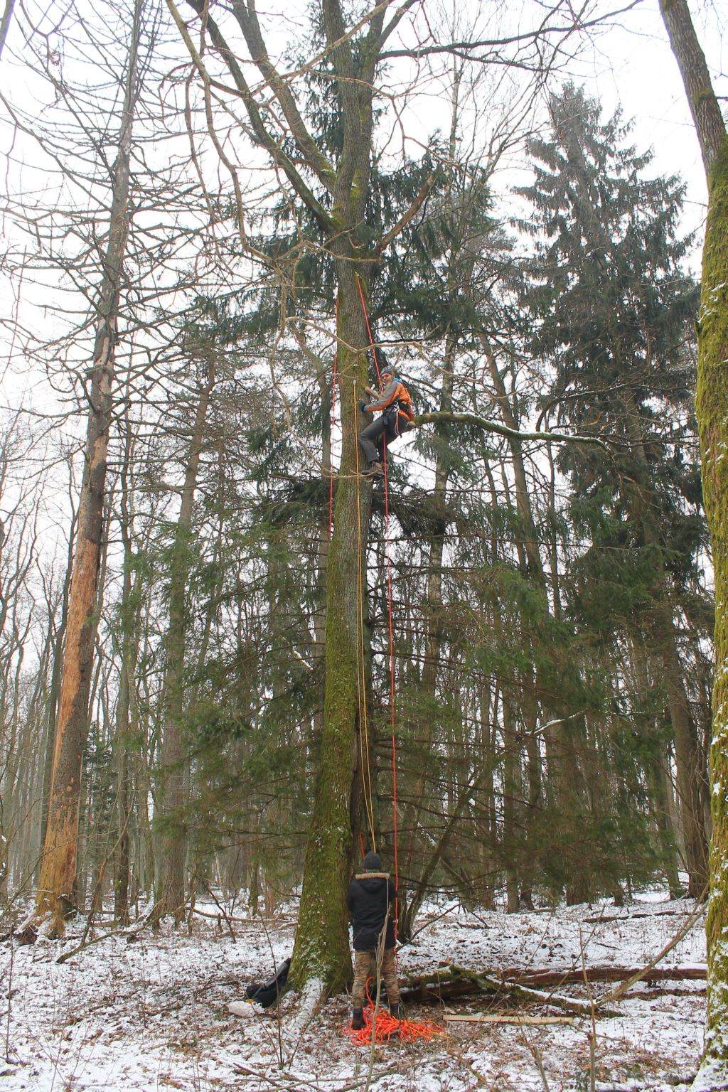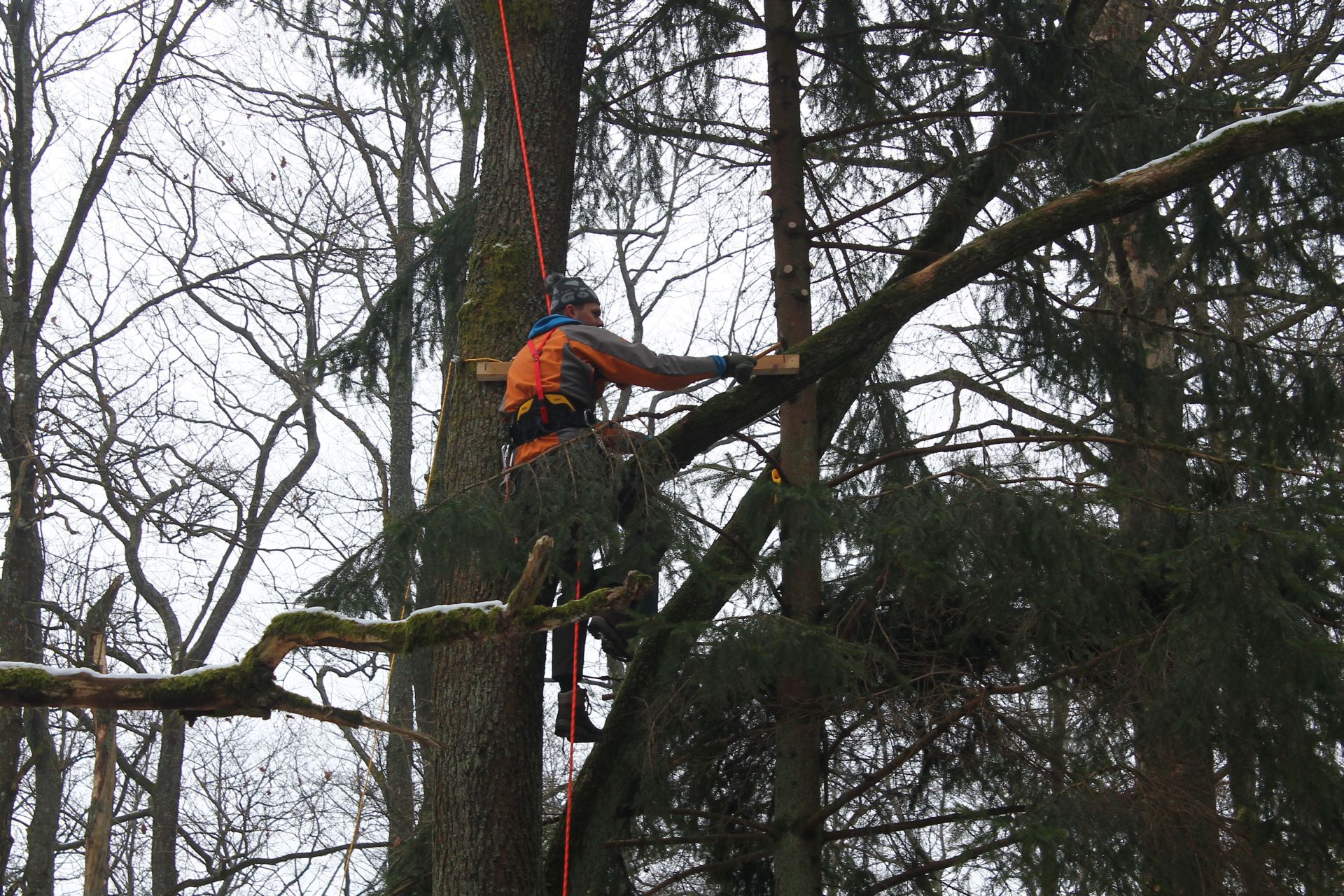 W ramach projektu ochrony ptaków strefowych zaplanowaliśmy budowę 10 platform gniazdowych dla bociana czarnego. Platformy będą wybudowane tam, gdzie bocianom nie poszczęściło się w ostatnich latach i ich gniazdo spadło. Budowa gniazd dla bocianów czarnych to nie lada wyzwanie. Niezbędny jest do tego sprzęt alpinistyczny. Podstawę gniazda stanową żerdzie natomiast pozostała masa gniazdowa zbudowana jest z materiału miejscowego tj gałęzi i mchu. Zdjęcia prezentowane poniżej pokazują budowę gniazda w Ostoi Warmińskiej.