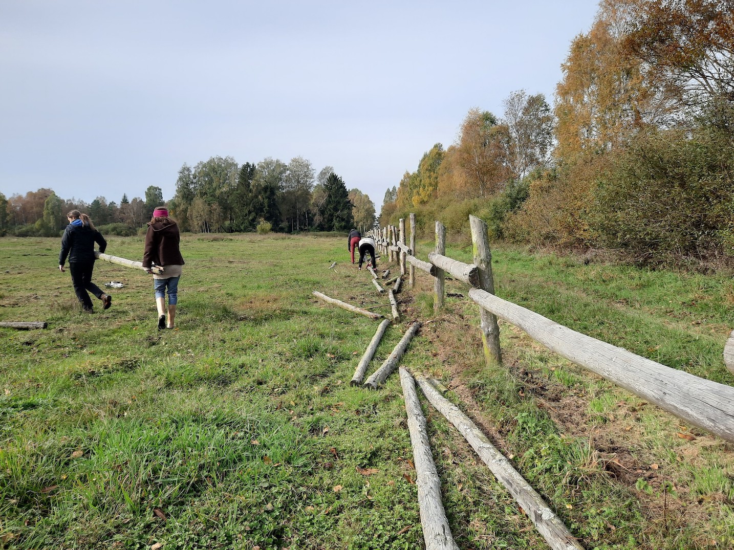 Na zdjęciach widać jak w kilka godzin 5 osób rozebrało 270m starego ogrodzenia, wyciągnęliśmy i zebraliśmy stare gwoździe. Drewno zostało posegregowane i ułożone w stosy. Na łące zostały tylko najtwardsze słupki, które wyciągnie profesjonalna ekipa stawiająca nowe słupki wykonane z przetworzonych tworzyw sztucznych. W ten sposób wymienimy 2700 mb ogrodzenia. Trwałość ogrodzeń drewnianych wynosi na naszych torfowiskach około 5-7 lat. Gwarancja producenta na plastikowe elementy ogrodzeń to 20 lat.