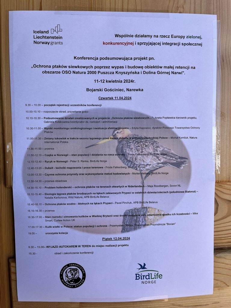 On April 11 and 12, took place a conference summarizing the project "Protection of waders through grazing and construction of small retention facilities in the Natura 2000 SPA area Puszcza Knyszyńska and the Upper Narew Valley".