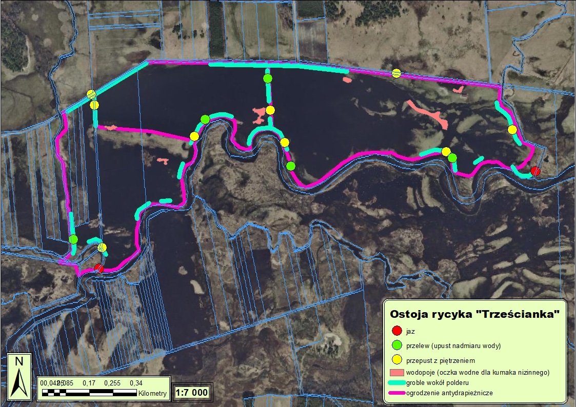 The planned works will consist in preserving and restoring grazing on an area of 85 ha through the construction of: electric antipredator fences on two indicated plots, of a total area of 85 ha, appropriate hydro-technical infrastructure enabling irrigation and water management on pastures in Charadriiformes refuges (21 dams, 19 dikes, 6 watering holes), renovation and construction of fences on winter pastures for horses grazing in spring and summer surrounded by electric fences, construction of 1 shed – a shelter from the sun on hot days and ensuring an appropriate number of animals for extensive grazing. In the "Gródek" refuge the grazed area surrounded by anti-predator fence is 26 ha, and in the "Trześcianka" refuge – 61 ha.