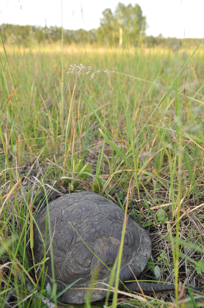 Jak co roku w maju i czerwcu prowadzony jest intensywnie monitoring lęgowisk żółwi na Mazurach. Osobiście kontolowałem działkę w okolicach Likus, która została wykupiona przez PTOP w 2013 roku w ramamch realizowanego projektu. Tę łąkę od dawna uważaliśmy za podejrzaną! W dużej odległości od jeziorka, w którym żółwie były widywane przez wędkarzy, jest to jedyne dobre miejsce na wykopanie dołka i złożenie w nim jaj, jest tam - sucho, słonecznie a trawą jest niska i rośnie w rozporoszeniu.