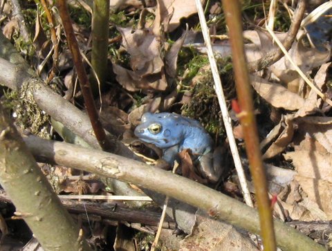 W planie były też obserwacje wygrzewających się żółwi. Niestety, ta okropnie opóźniona wiosna sprawiła nam figla - w zajmowanych przez nierozlewiskach zalegał jeszcze lód, miejscami nawet sporo, więc gady zapewne jeszcze nie wybudziły się z hibernacji zimowej. Musiały nam wystarczyć liczne żaby moczarowy w intesywnie niebieskich, godowych barwach.