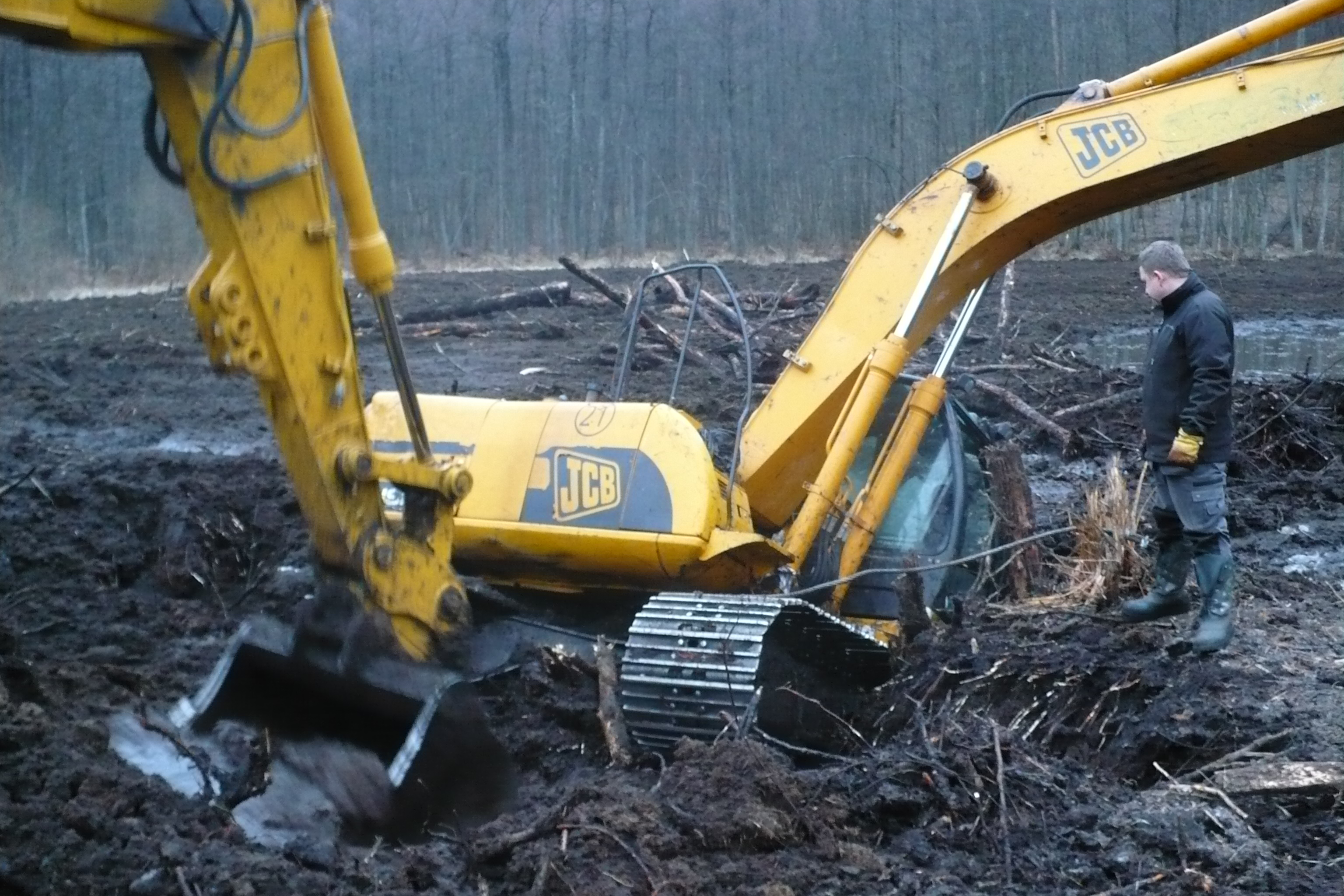Niby mrozy trochę ścięły wierzchnią warstwę ziemi, niby pod gąsienice były podkładane bale, ale mimo to mazurskie bagna wczoraj omal nie pochłonęły koparki, wykańczającej jeden ze stawów przeznaczonych dla płazów i żółwia błotnego. Dzielni wykonawcy z firmy Dos Patos (co ponoć znaczy po hiszpańsku "dwie kaczki") już opanowali sytuację, wydobyli maszynę i teraz ją reanimują.