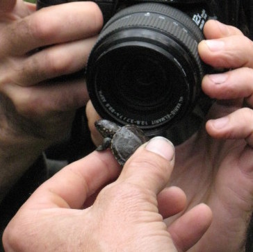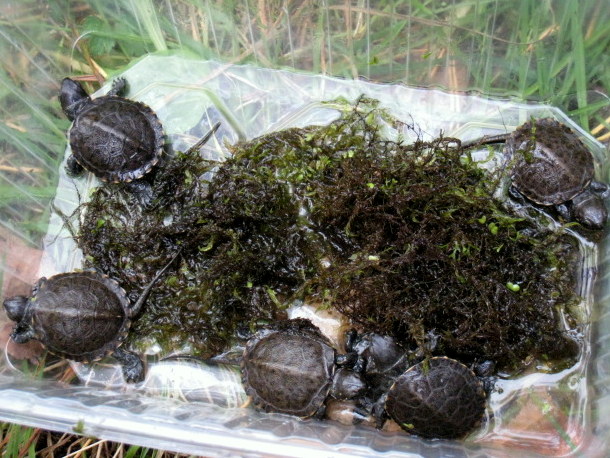 Jest nas większa ekipa, bo nasz skład wzmacniają przedstawiciele RDOŚu, olsztyński herpetolog Krzysztof Majcher, przedstawiciele Lasów, dziennikarz Gazety Olsztyńskiej (jego artykuł można przeczytać http://nidzica.wm.pl/124500,Soltys-Likus-ojcem-chrzestnym-12-malych-zolwikow.html#axzz2Iz4ZUalH ) oraz sołtys Likus, pan Hubert Breński, który w uznaniu za swoje liczne zasługi w badaniu i ochronie lokalnej populacji żółwia został honorowym ojcem chrzestnych żółwiątek. Każde zostało obfotografowane (istnieje możliwość rozpoznania później po układzie plamek na głowie – metoda pracochłonna, ale zawsze) i wpuszczone do stawu, w którym w kilka sekund zniknęło. Teraz przed nimi najtrudniejszy okres życia – takie maleństwo może połknąć nie tylko czapla czy szczupak, ale nawet upolować duży bezkręgowiec w rodzaju płoszczycy czy larwy ważki. Trzymajmy za nie kciuki!